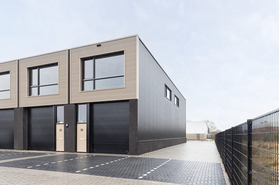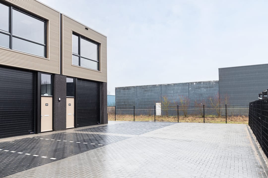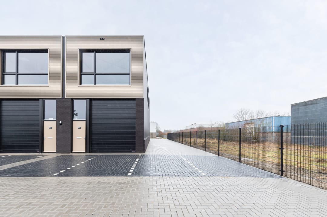 - afsluitbaar buitenterrein aan de zijkant van de bedrijfsunit, voorzien van een dubbelstaafmat hekwerk van ca. 2,50 meter hoog en een handbedienbare toegangspoort van ca. 2,50 meter breed;