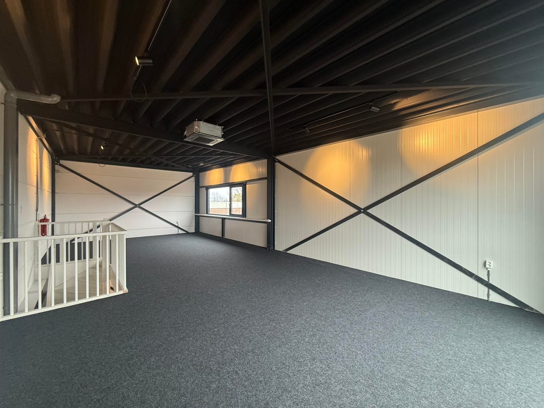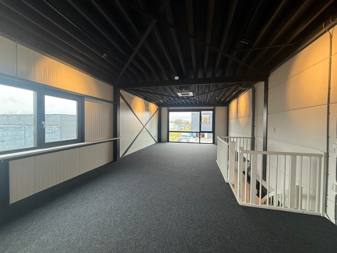 De bovenverdieping is voorzien van grote raampartijen in voorgevel en raampartij in zijgevel, waardoor er veel natuurlijk daglicht binnenvalt — een prettige werkomgeving die zich uitstekend leent als kantoor- of showroomruimte.