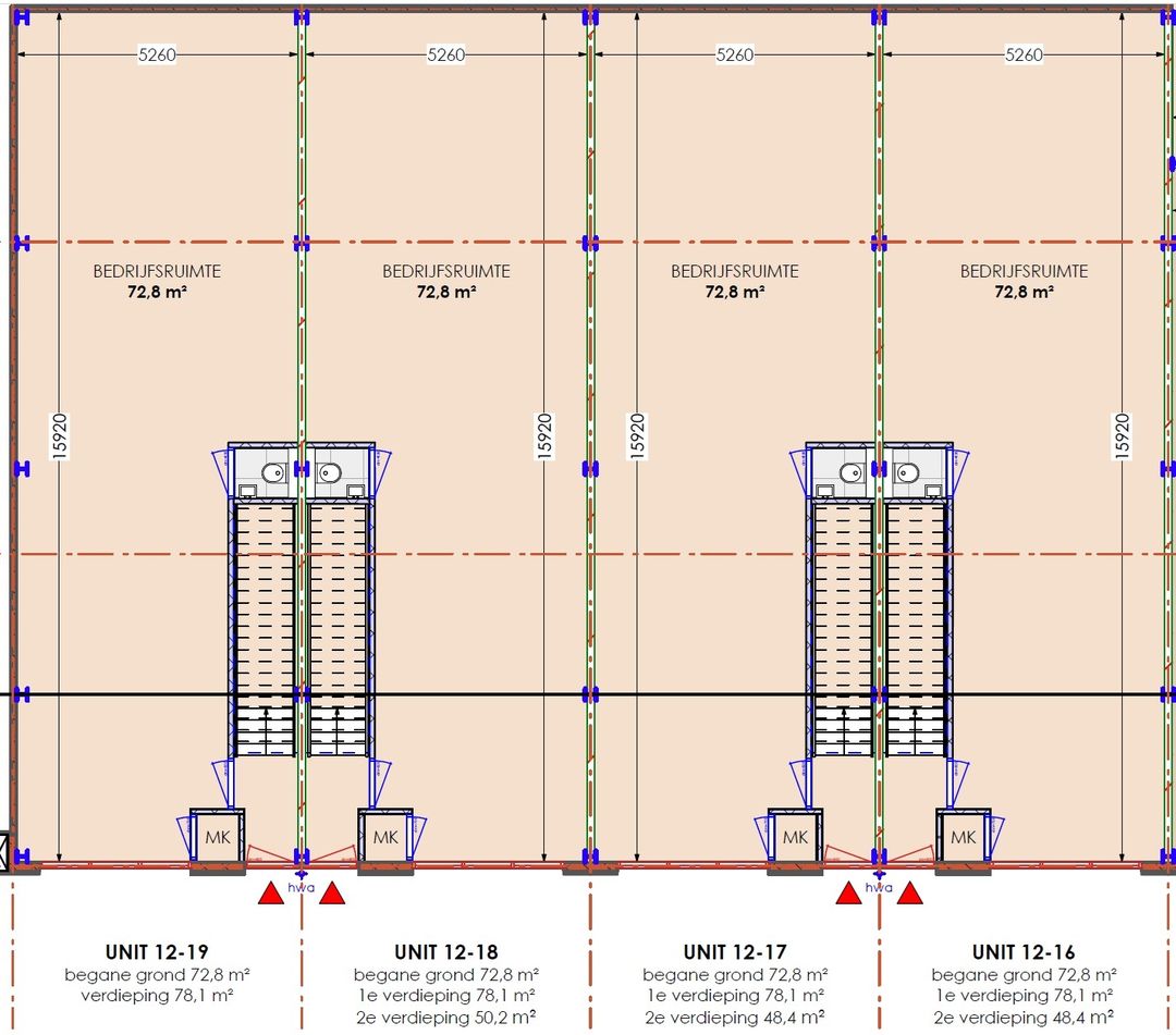 NB: Oppervlaktes zijn indicatief (ca. BVO), inclusief verdiepingen en eventuele dakterrassen. Units kunnen worden gekoppeld.