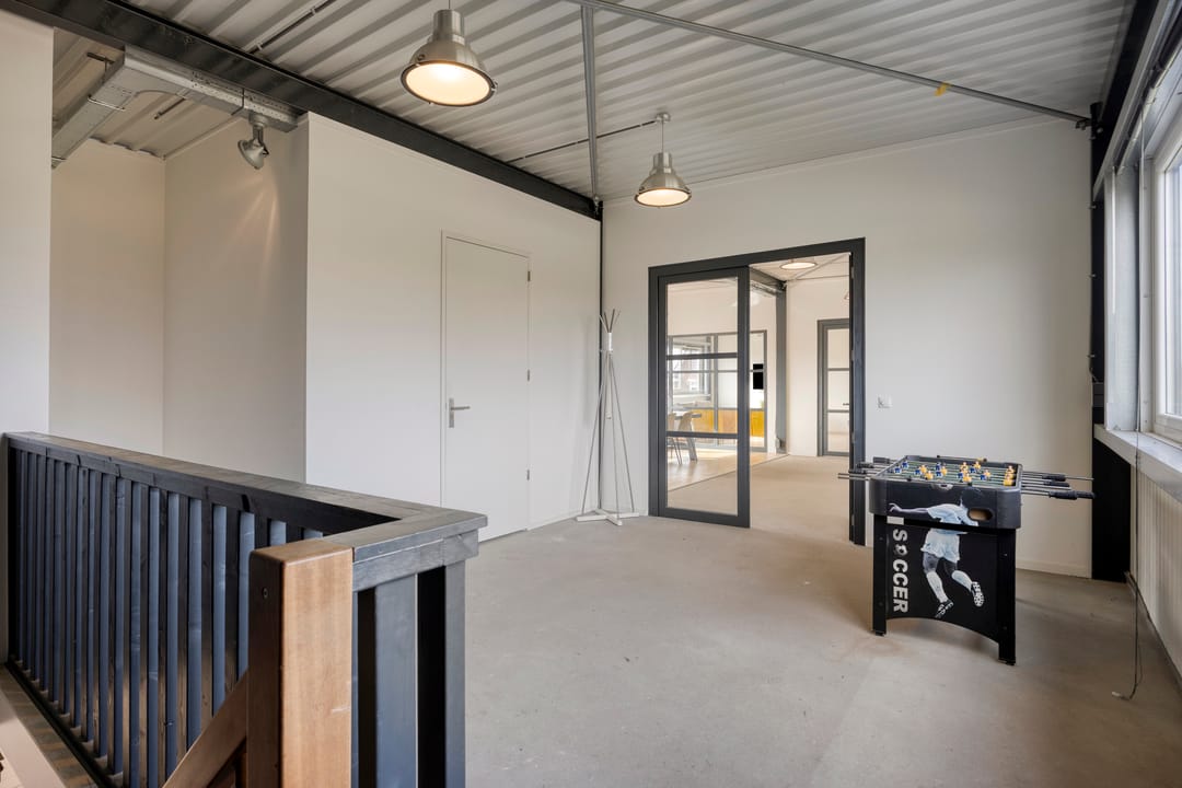 1e: De verdieping is bereikbaar via een vaste trap en u komt eerst in een ruime hal. Aan de linkerzijde bevinden zich 2 toiletten en een opslagruimte (eenvoudig te transformeren tot kantoorruimte) met toegang tot een technische ruimte. Vervolgens komt u in een afgesloten kantoorruimte met open keuken en 2 bergingen. De keuken is voorzien van een vriezer, koelkast, vaatwasser en een inductie kookplaat. Vanuit deze ruimte heeft u toegang tot een tweede, ruime kantoorruimte. De aanwezigheid van ramen rondom zorgt voor veel licht in alle ruimten. Vanaf de verdieping heeft u achter uitzicht op natuur- en recreatiegebied De Groenzoom.