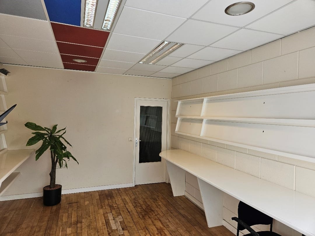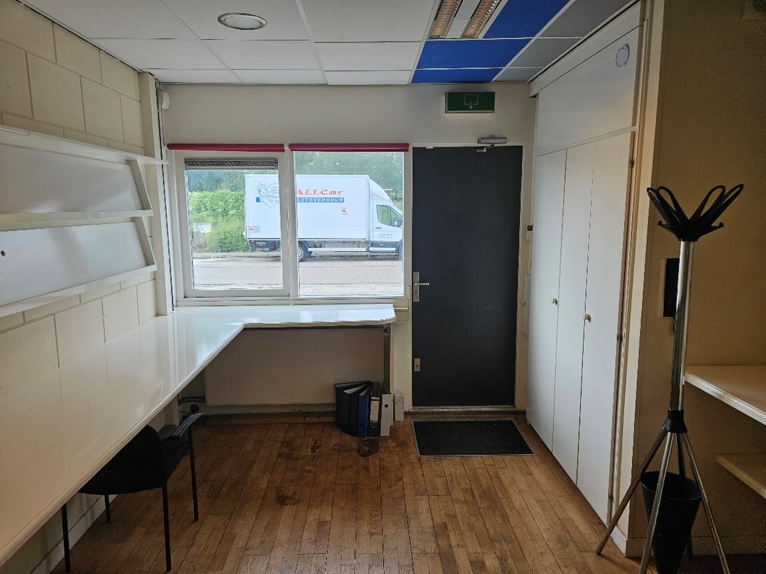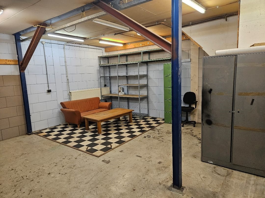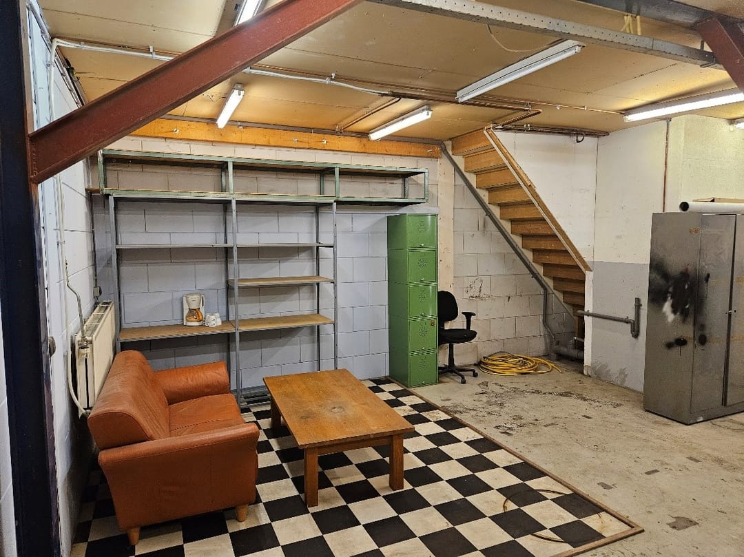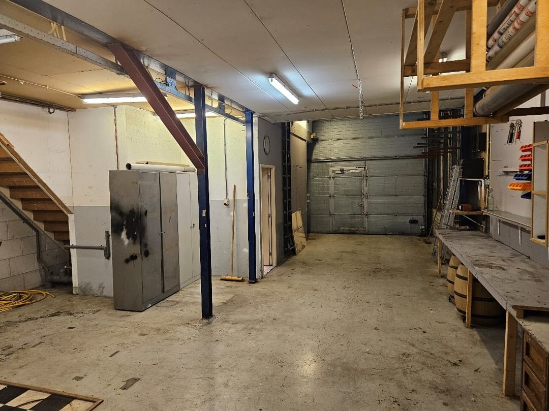 De bedrijfsruimte direct achter de overheaddeur beschikt over volledige hoogte tot onderkant dak.
