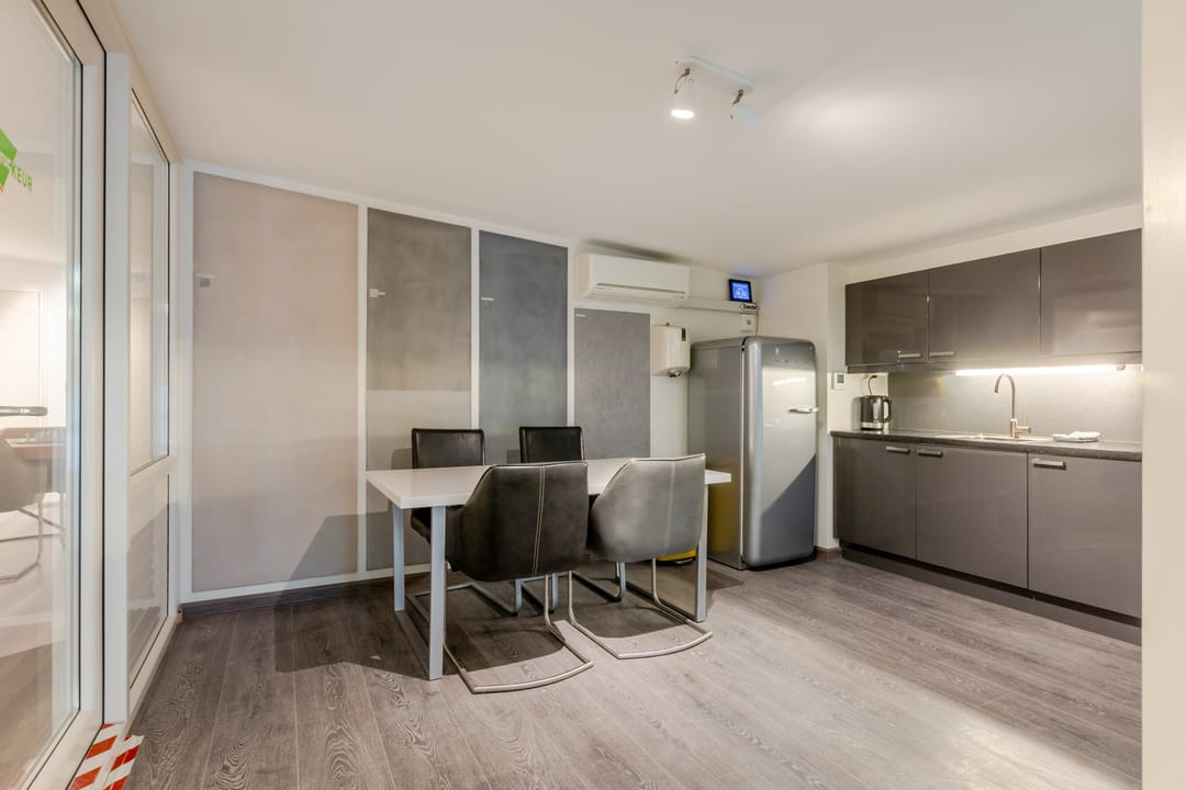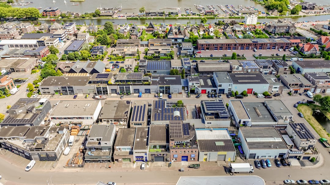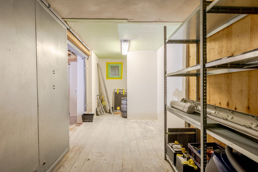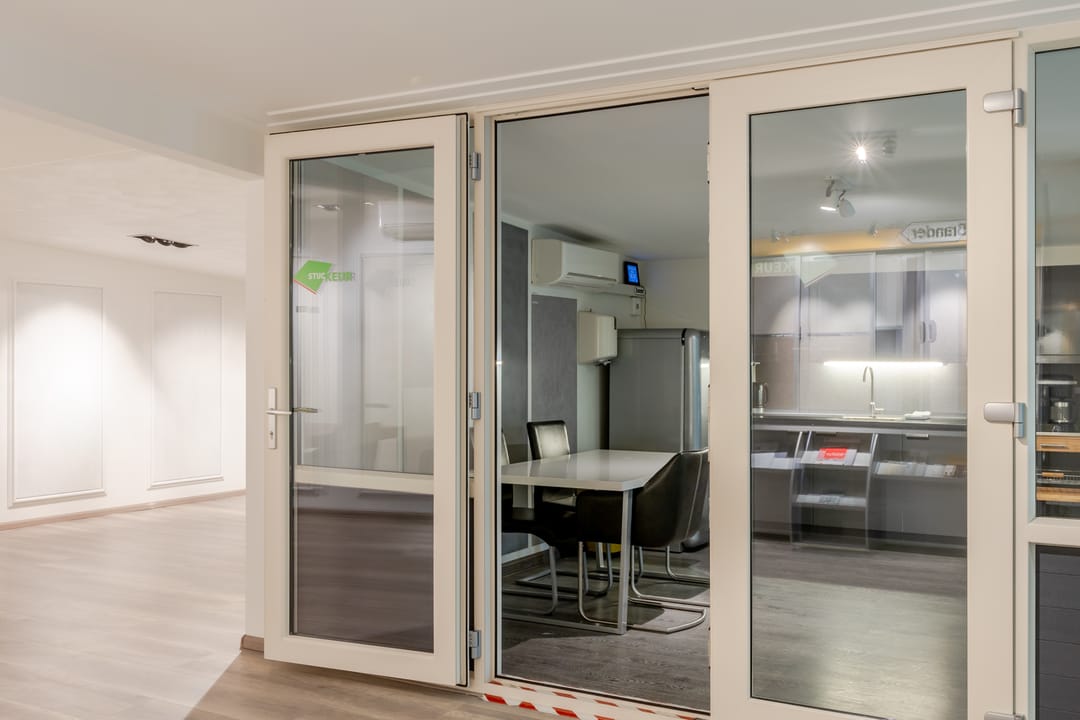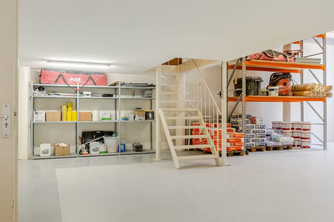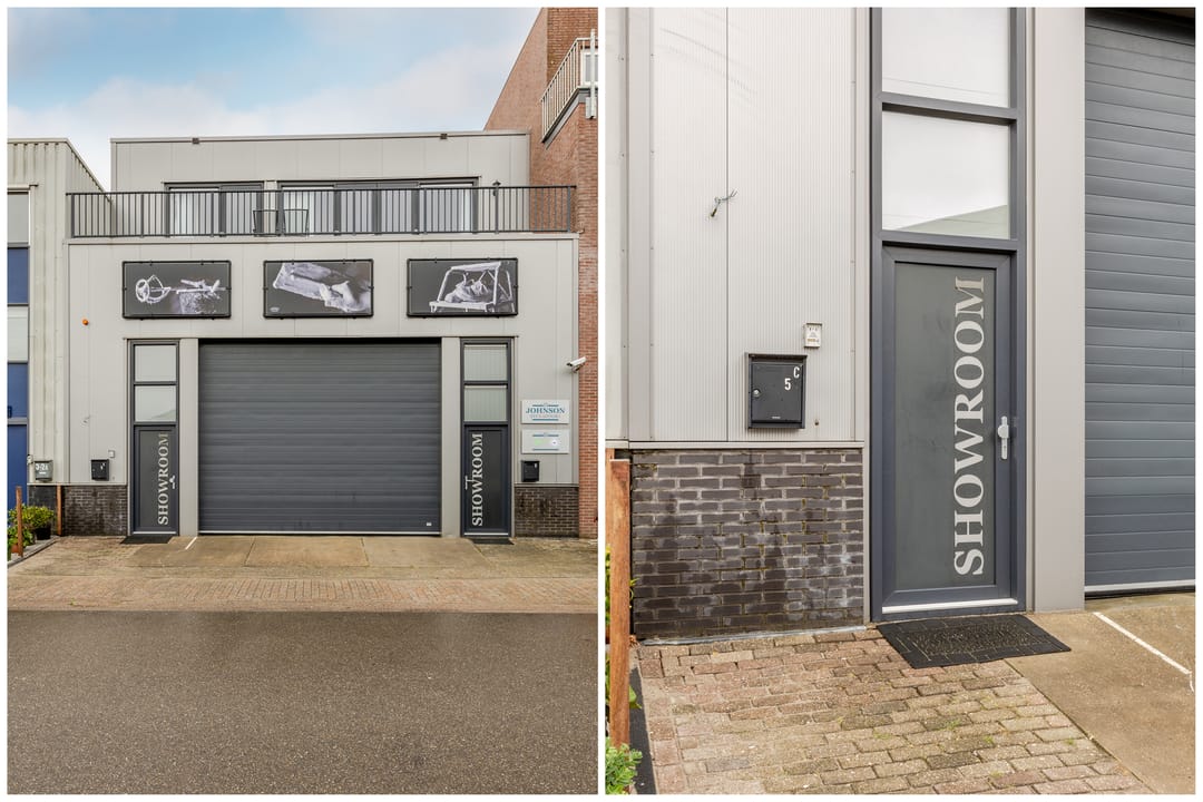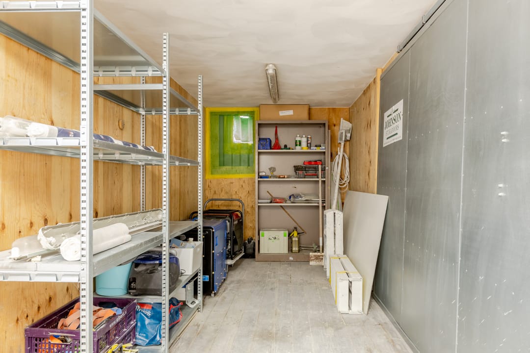 - achter de bedrijfsruimte is op het achterterrein een zeecontainer geplaatst. Deze is verbonden met de bedrijfsruimte, in deze verbinding is een schuifdeur aanwezig.