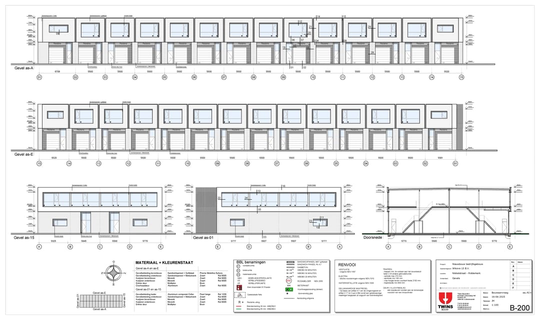 - gevels begane grond metselwerk met daarboven sandwichpanelen, geïsoleerde gevelbeplating (Rc-4,7) en deels hout sierelementen;