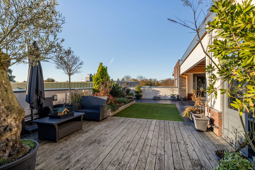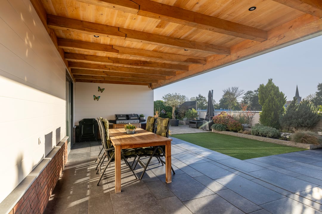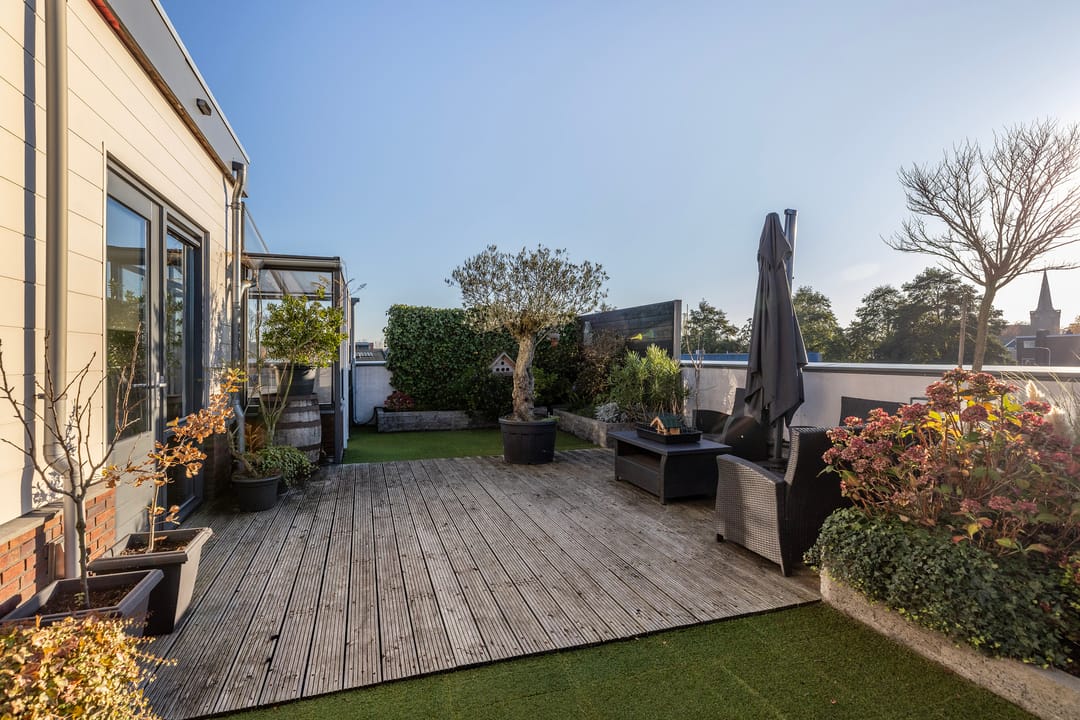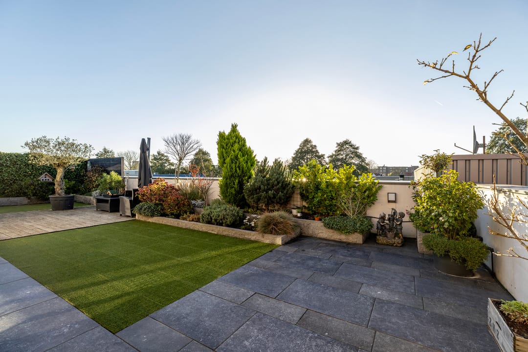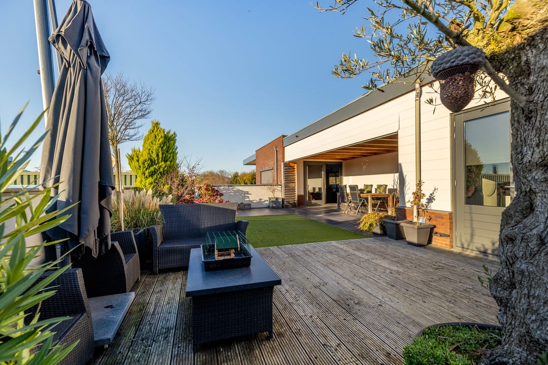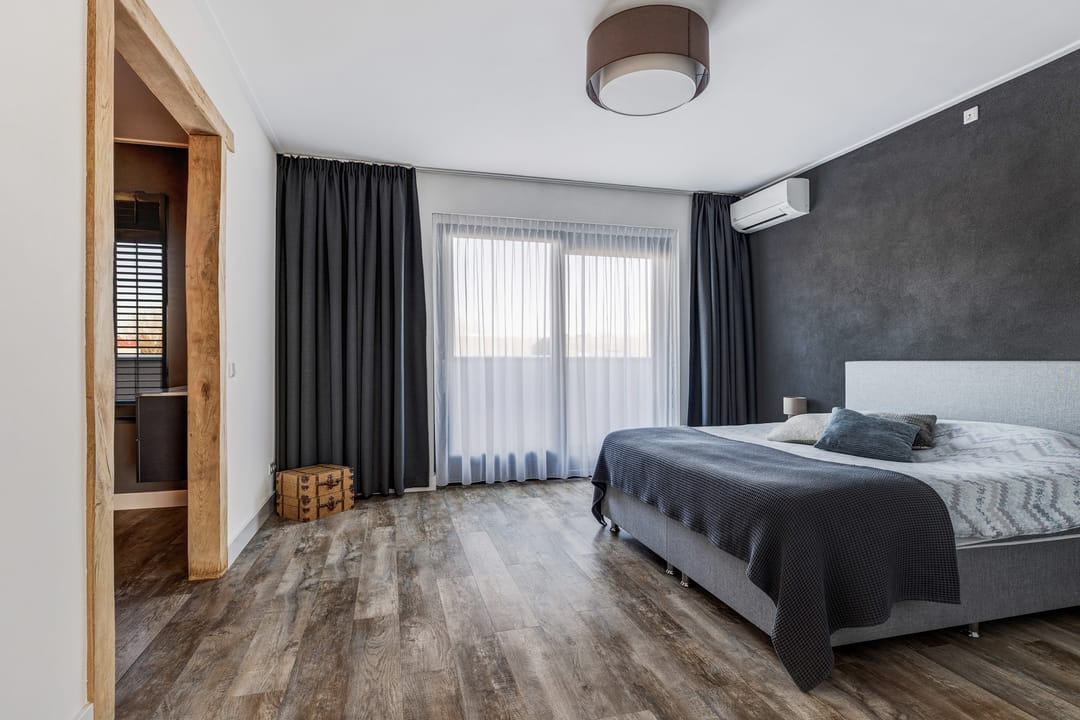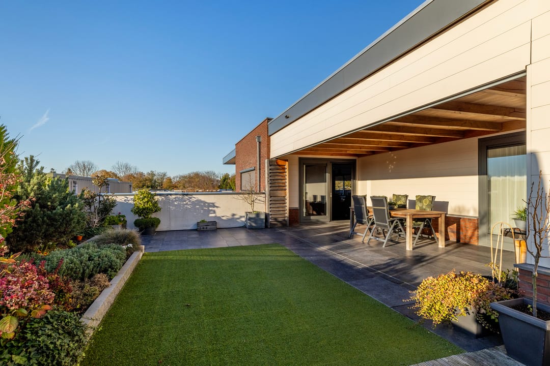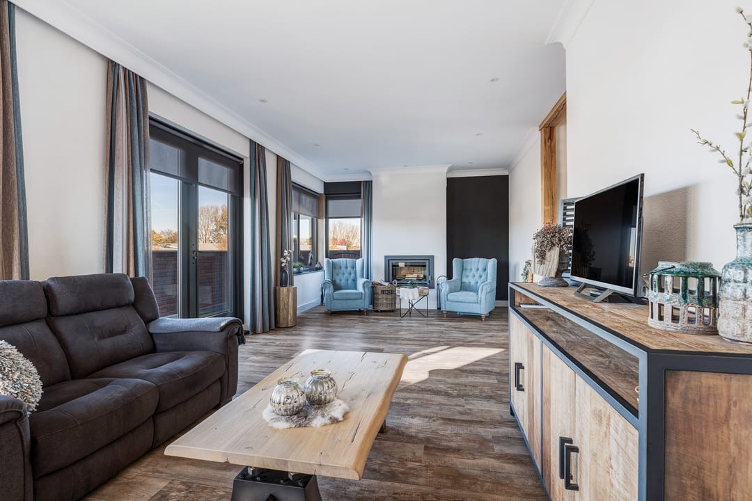 De bovengelegen woning – gebouwd in 2019 – is een luxe appartement met een hoogwaardige afwerking, veel leefruimte, een zonnig dakterras en duurzame installaties zoals 50 zonnepanelen en warmtepompen. Een eigen entree zorgt ervoor dat de woning volledig zelfstandig te gebruiken is, eventueel te verhuren of ideaal voor wonen boven het eigen bedrijf.