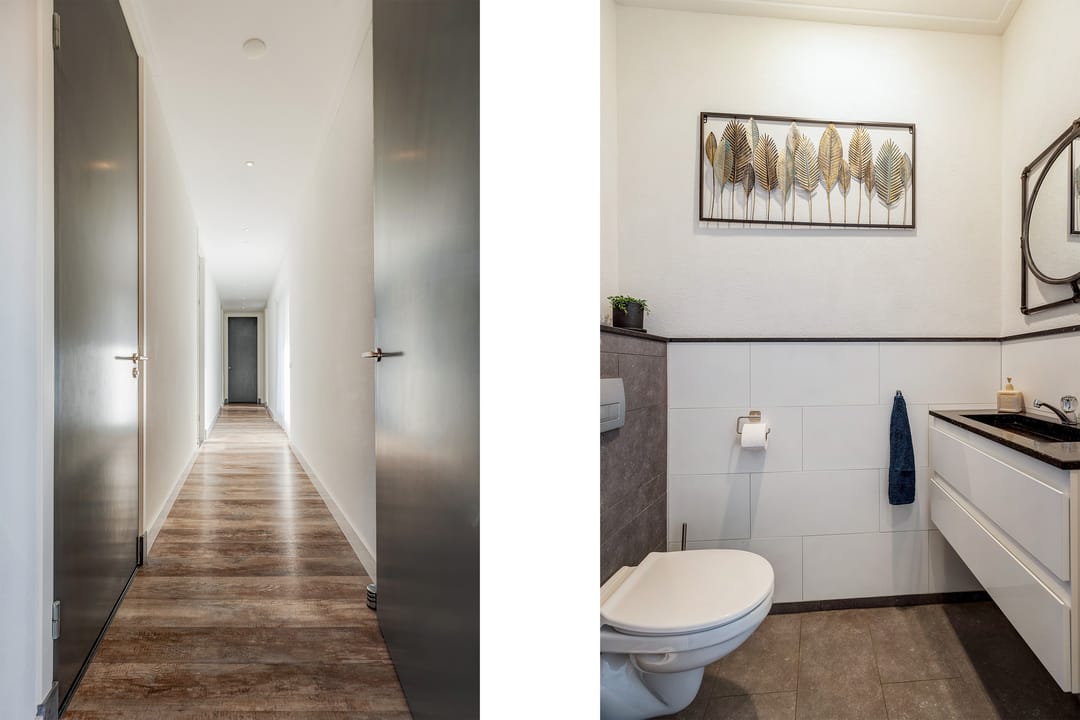 • Apart toilet met hangend closet, fonteintje en grijze wandtegel