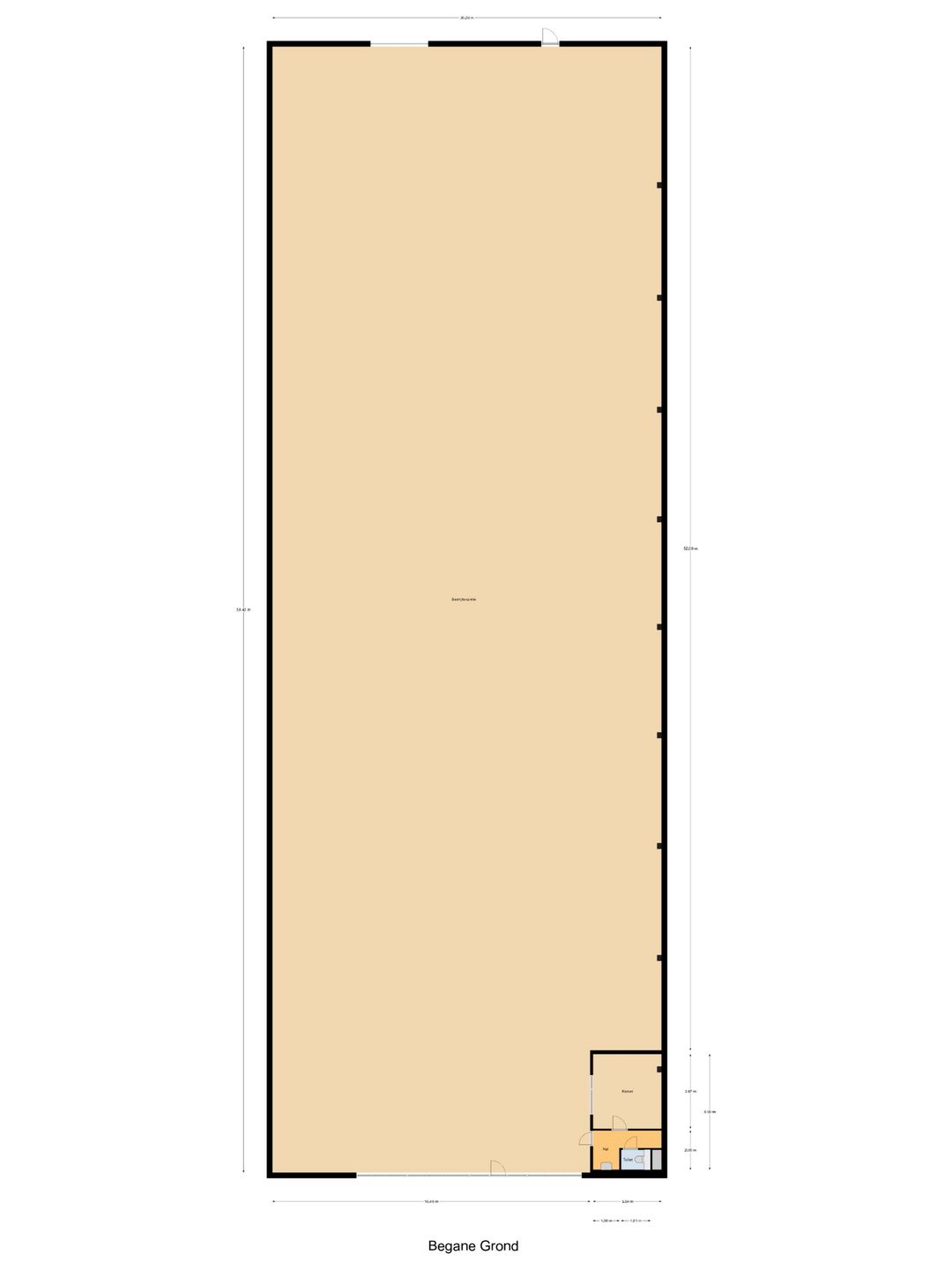 - Afmeting bedrijfshal (binnenmaat) is 20,20 x 58,43 meter.