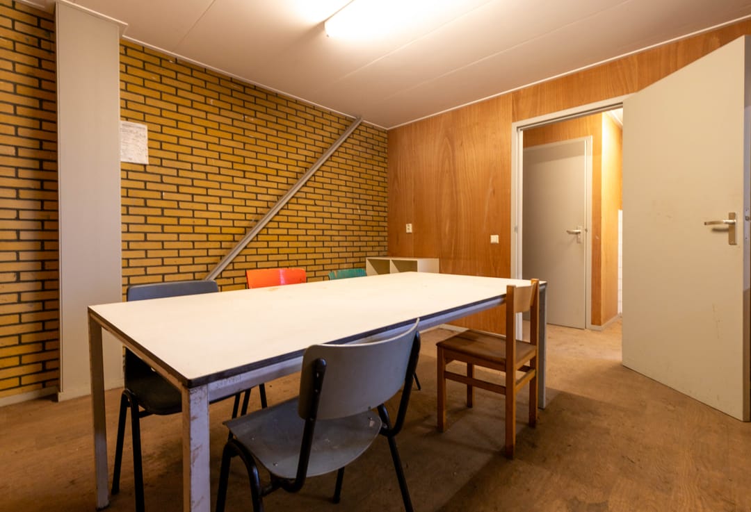Aan de voorzijde bevindt zich een inpandige kantoor-/kantineruimte met bijbehorende sanitaire voorzieningen. Deze ruimte is praktisch ingericht en biedt ondersteuning aan het gebruik van de bedrijfshal.