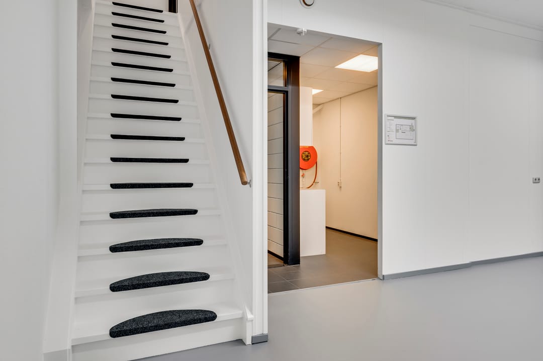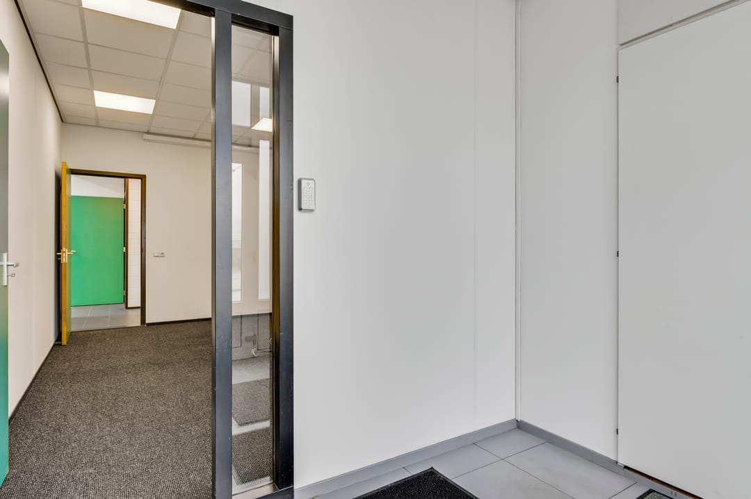 >Entrée met toegang tot het portaal, kantooruimte en bedrijfshal.