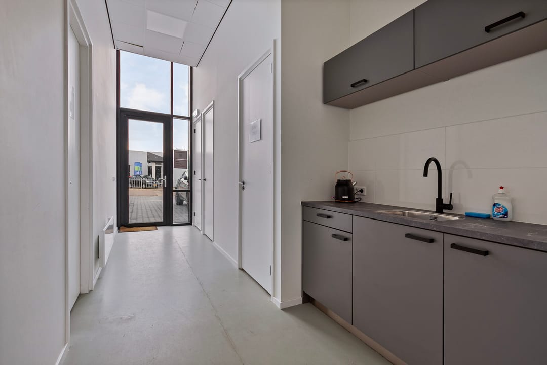 Binnen beschikken de bedrijfsruimten over een verzorgde kantoorruimte van ongeveer 20 m². Deze is netjes afgewerkt en voorzien van een praktische pantry