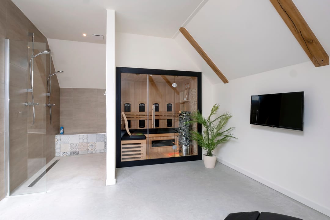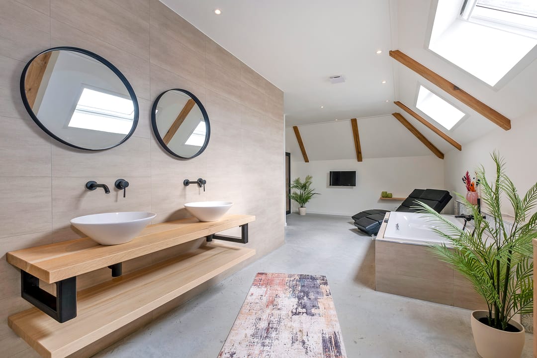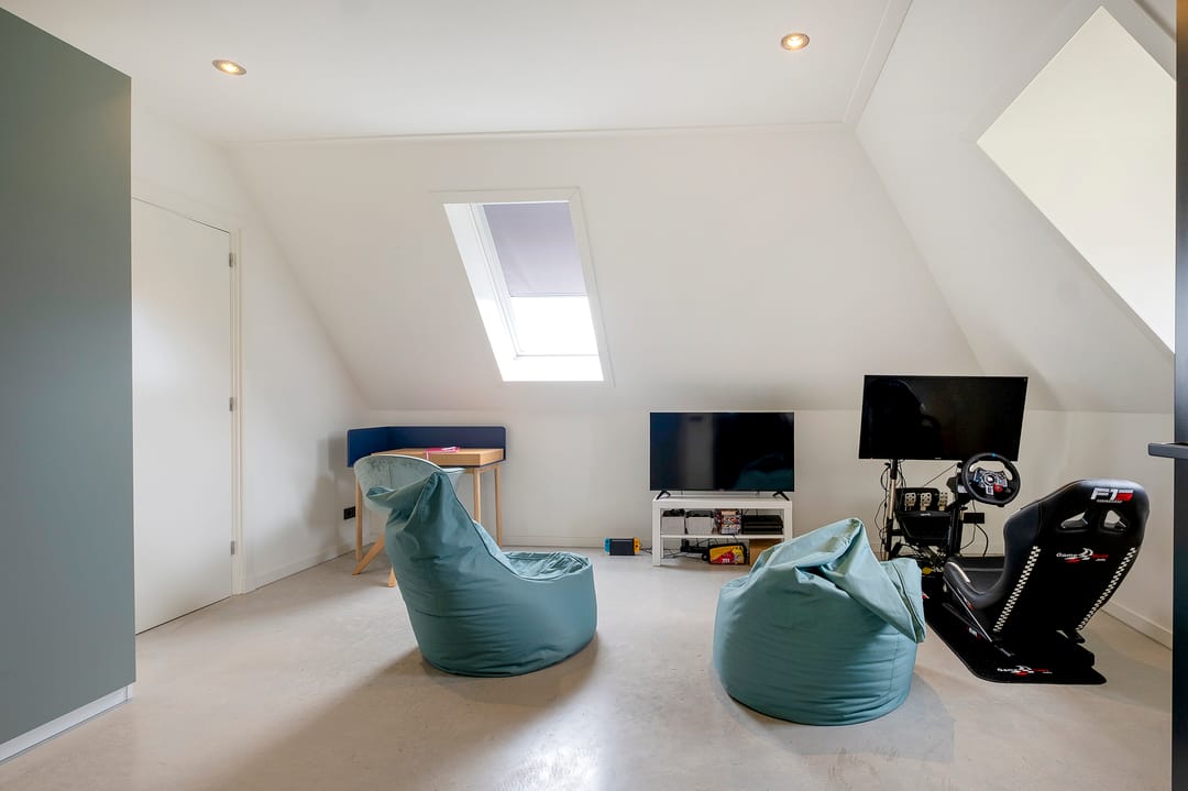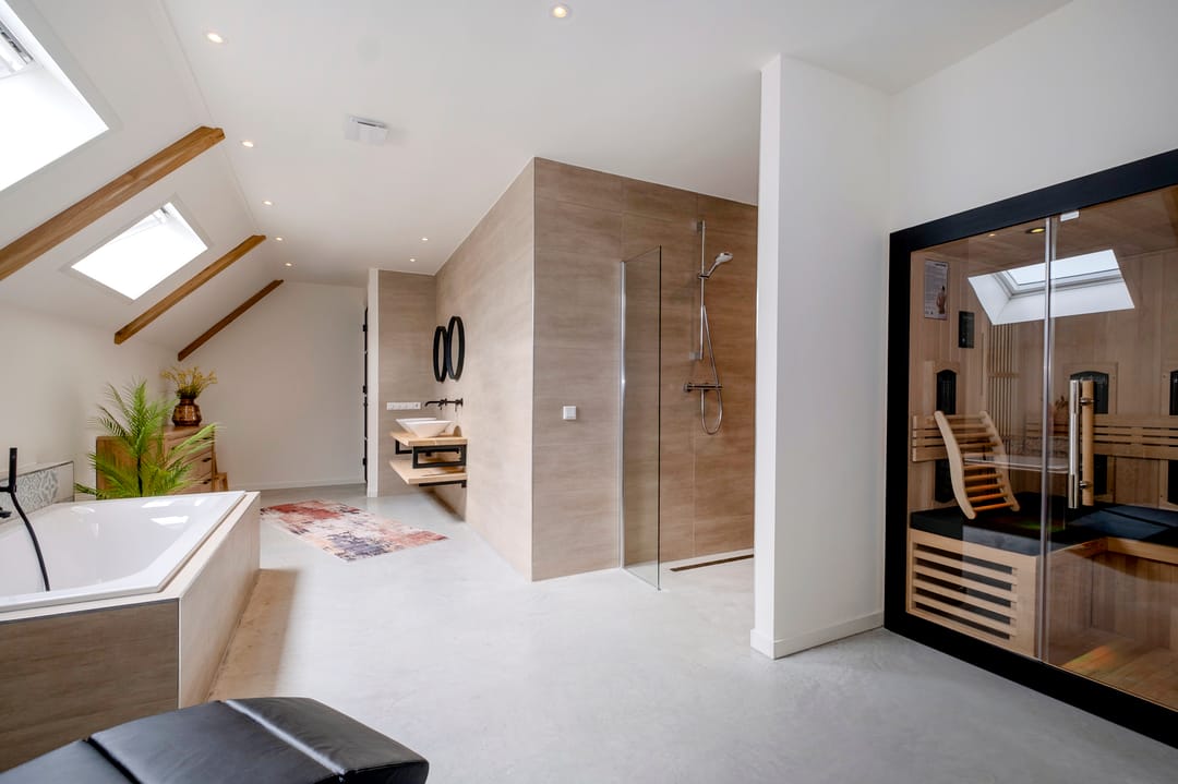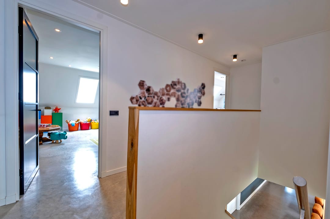 Overloop, twee zeer royale slaapkamers (indien gewenst is het mogelijk een slaapkamer op te delen in 2 slaapkamers), wasruimte, toilet met urinoir en wellness badkamer (voorzien van sauna-Fins & Infrarood, dubbele inloopdouche, ligbad en dubbele wastafel).