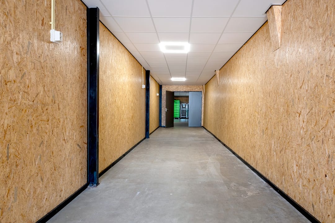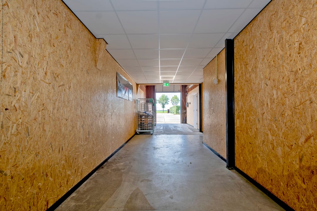 Entree/hal, pantry (voorzien van keukenblok), kantoorruimte (ca. 100 m²), trapopgang naar de verdieping, toilet, meterkast en zicht vanuit de kantoorruimte naar het voorste magazijn met systeemplafonds en verwarming. Achter het voorste magazijn een tweede magazijn voor extra opslag.