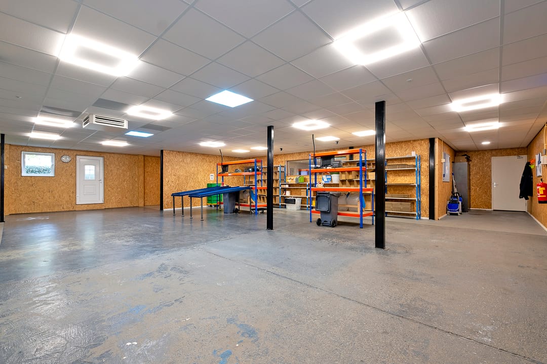 Entree middels grote overheaddeur, de ruimtes zijn verdeeld in 3 compartimenten perfect voor een opslagruimte/magazijn. Aangrenzend treft u een expeditiegang, werkruimte/grote berging, stookruimte en een extra berging.