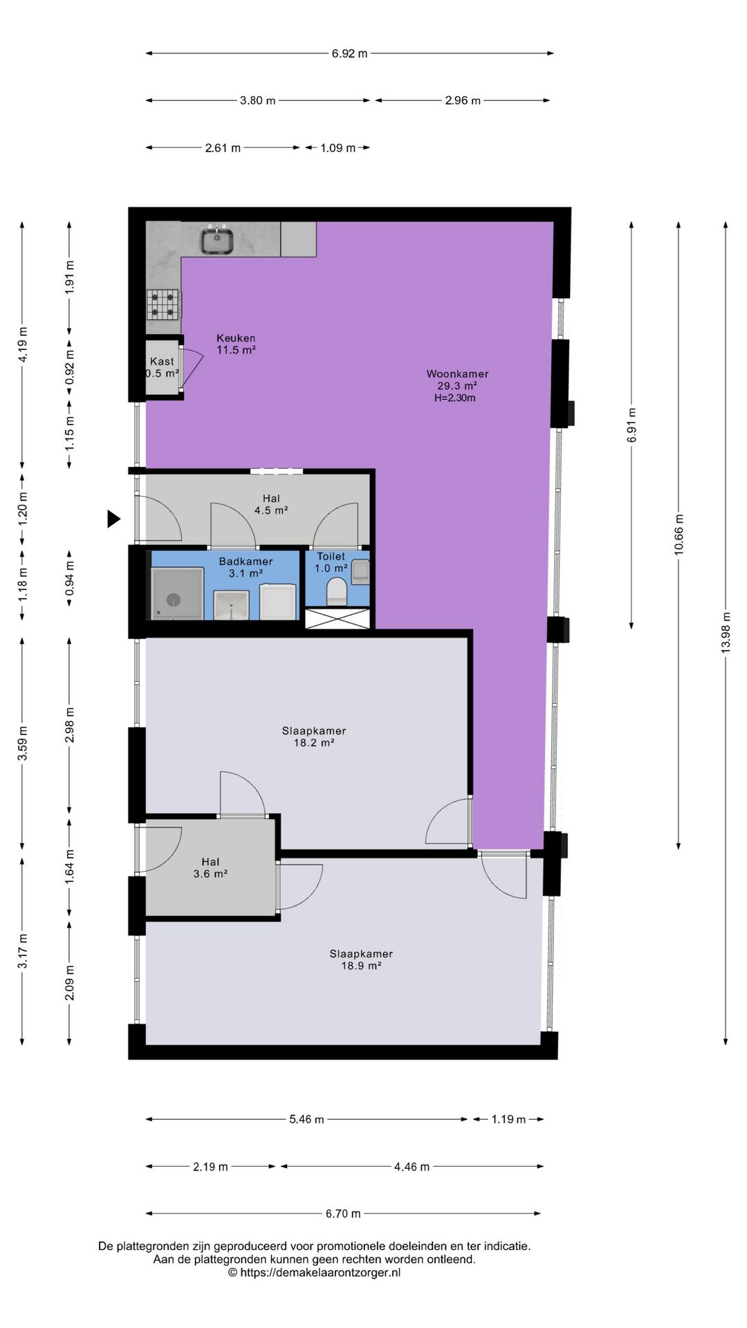 Entree/hal, woonkamer met open keuken voorzien van inbouwapparatuur, toilet met fonteintje, twee slaapkamers en een badkamer (voorzien van wastafelmeubel, douchecabine en wasmachineaansluiting).