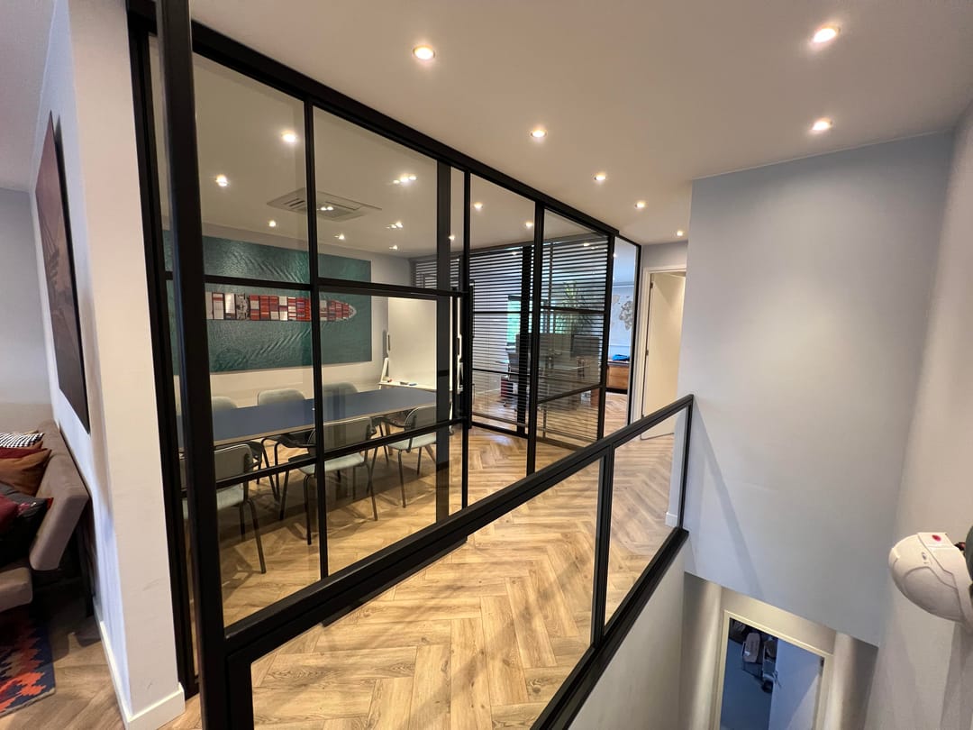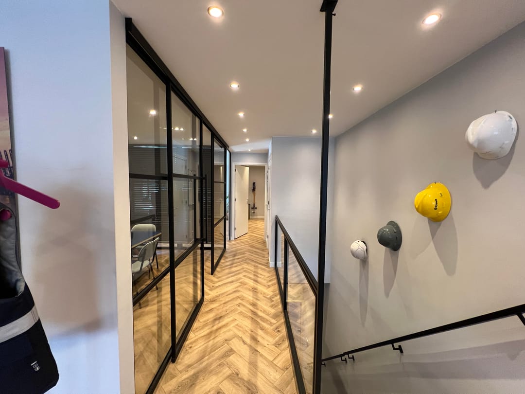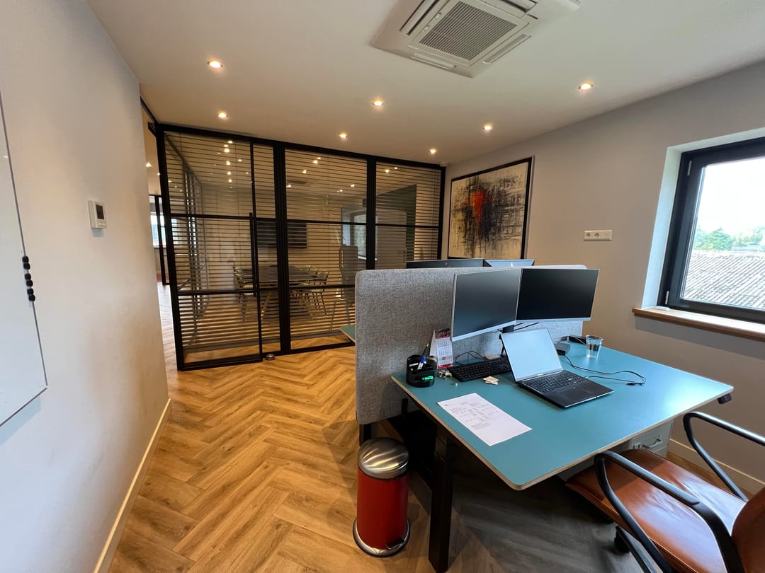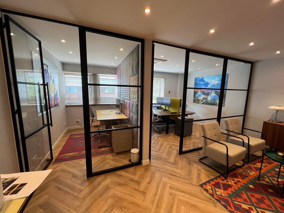 - middels scheidingswanden met veel glas in gedeeld ingedeeld in 3 kantoorcompartimenten, een spreekkamer en keuken;