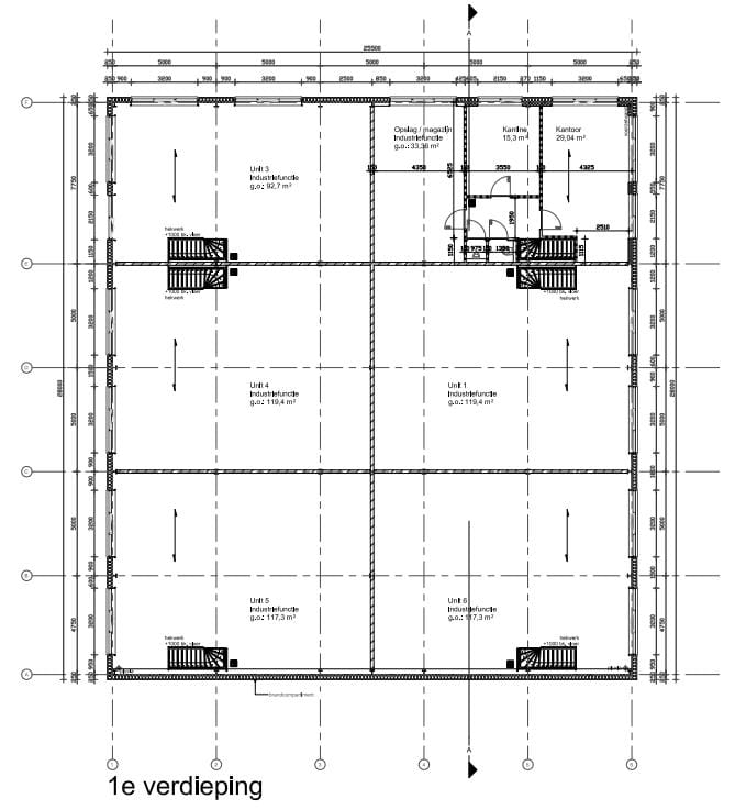 Unit 3 E (90-G) beschikt over een gebruiksoppervlakte van ca. 234 m² (115 m² op de begane grond en 119 m² op de eerste verdieping).