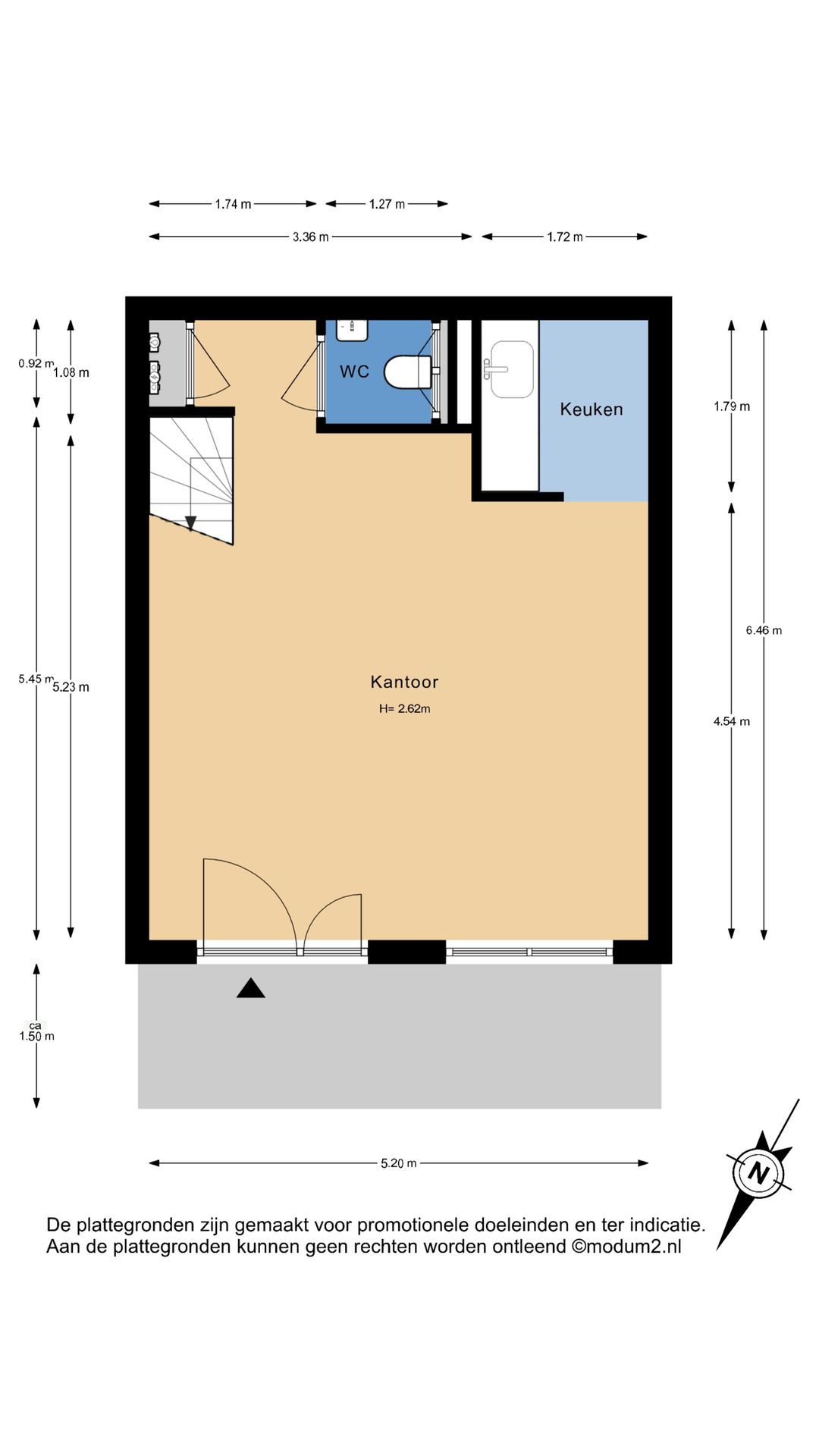 De unit is 6,46 meter diep en 5,20 meter breed. In totaal heb je de beschikking over ca. 64 m2 (VVO) bedrijfs-/kantoorruimte verdeeld over de begane grond en eerste verdieping.