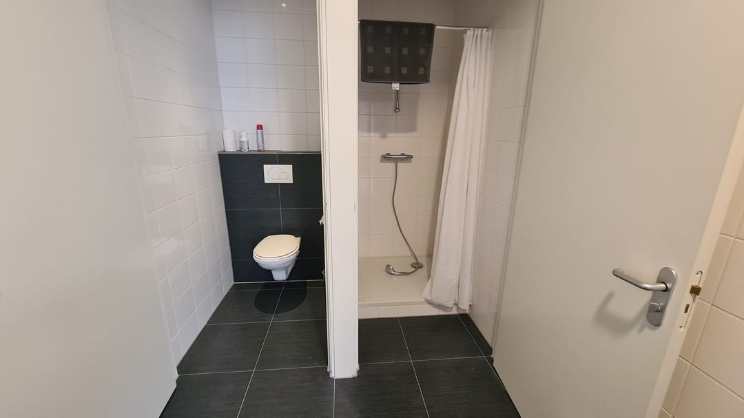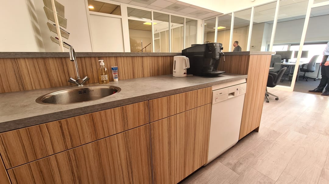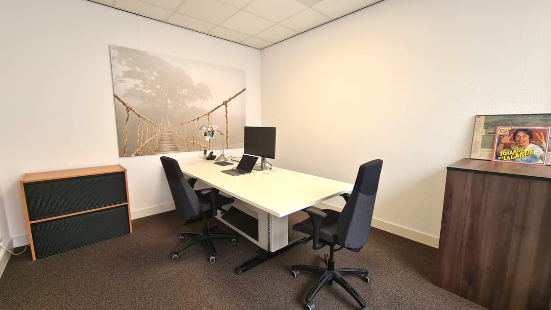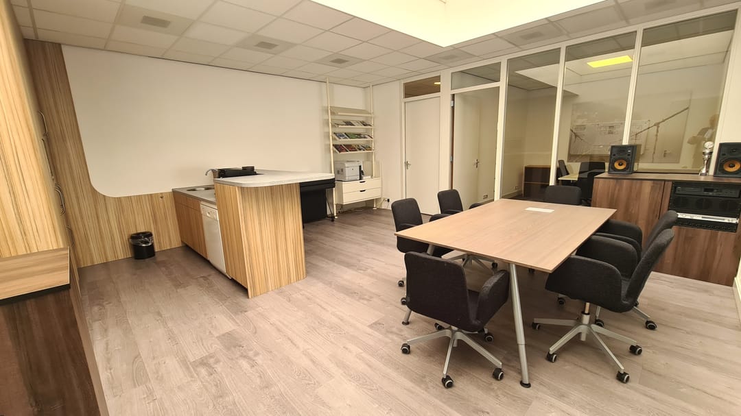 Ruime centrale ruimte met fraai keukenblok en tafel voor b.v. de lunch. Twee kantoorkamers waarvan één in gebruik als kantoortuin. Toilet en douche.