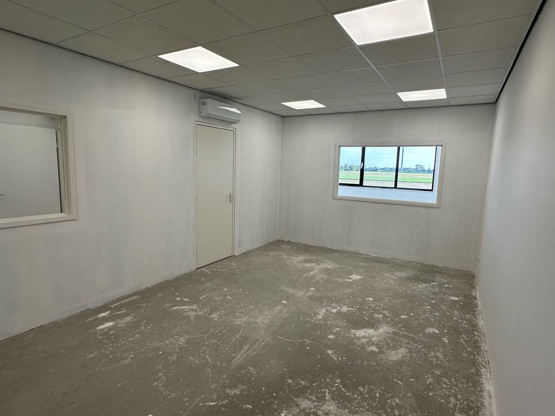 - Air conditioning, overhead doors, concrete floor, toilet, built-in fittings and windows can be opened