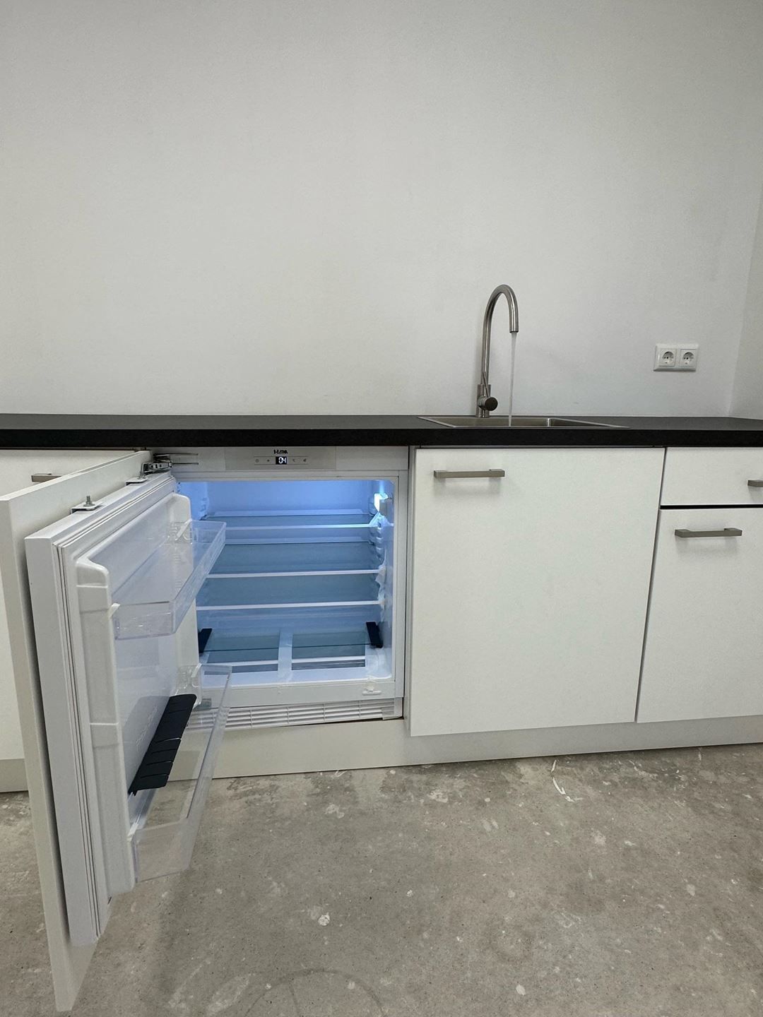- 2 keukens met een koelkast (Atag), spoelbak, kraan en een zwart blad.