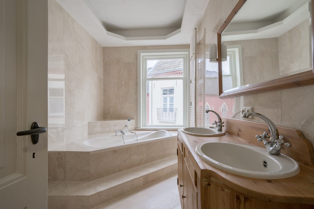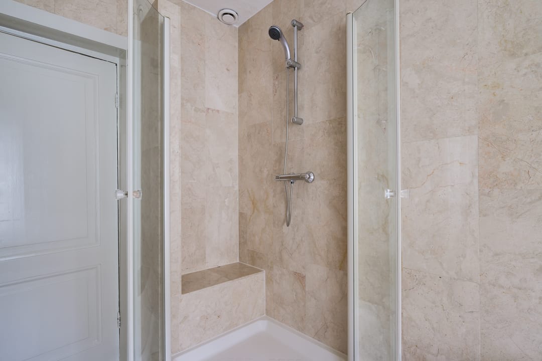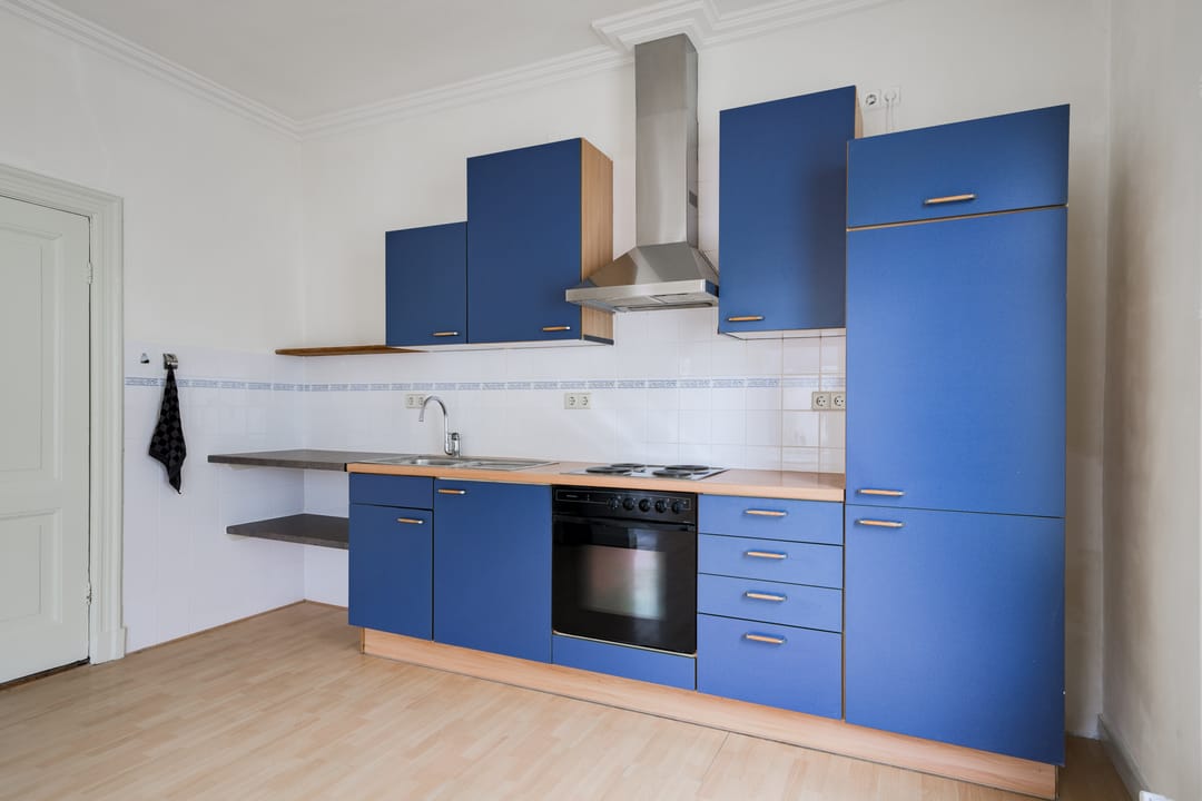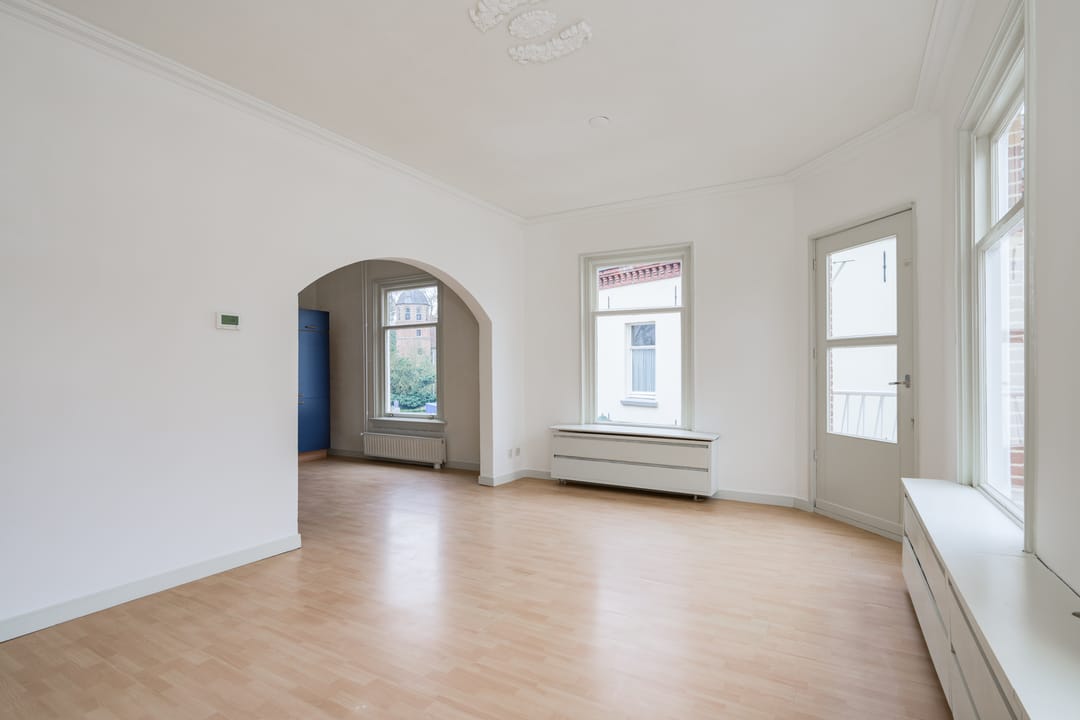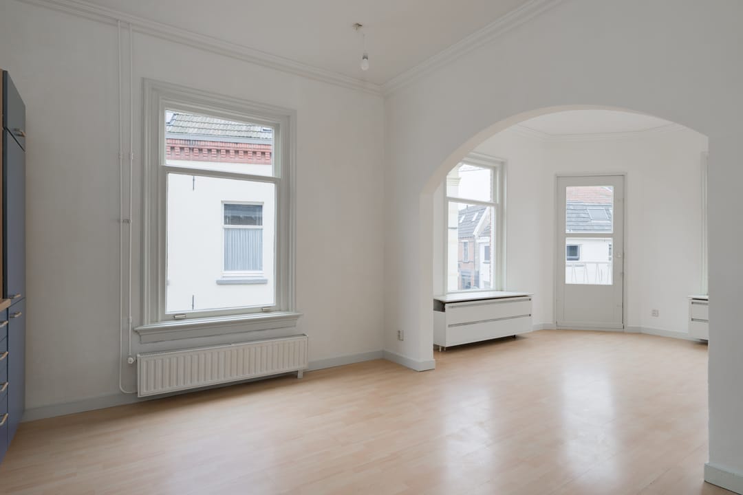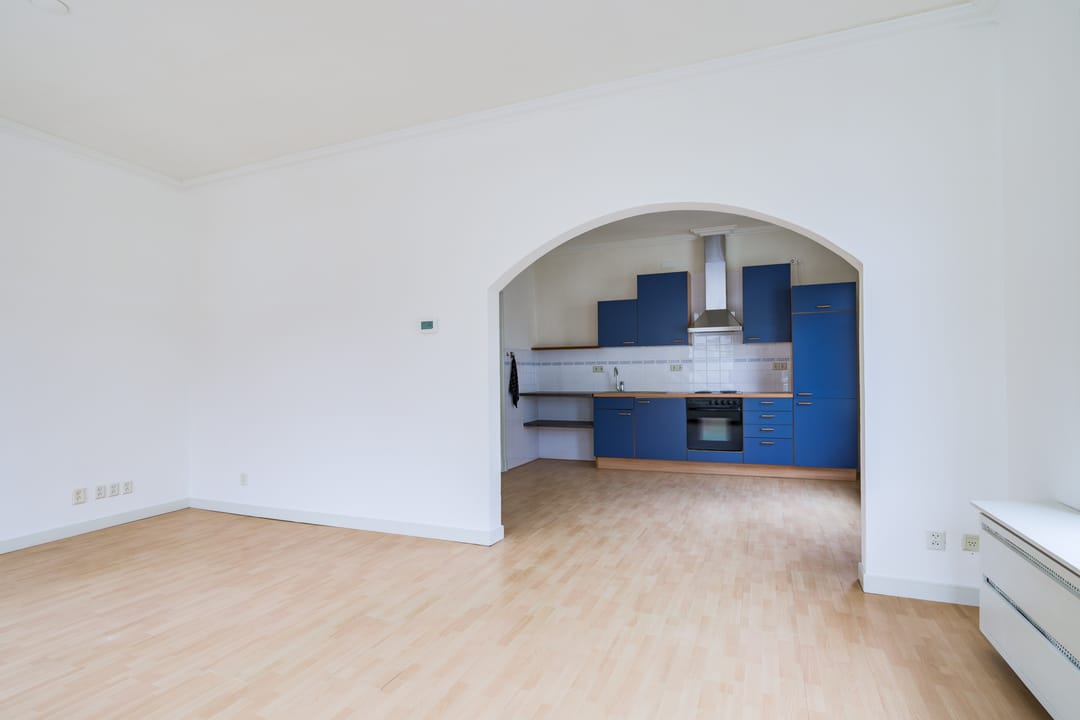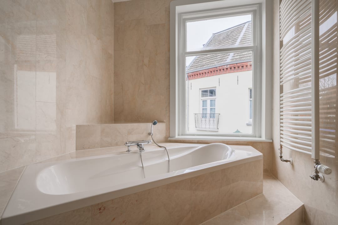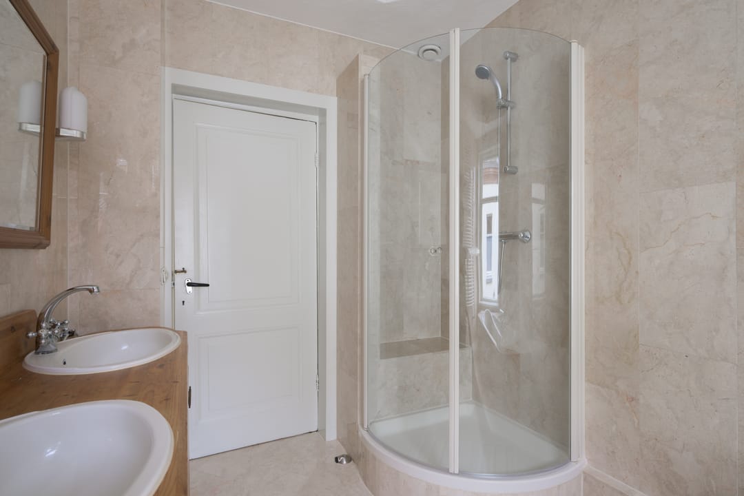 De keuken is uitgevoerd in een eenvoudige rechte opstelling en voorzien van een oven, elektrische kookplaat, afzuigkap, spoelbak, koelkast. Via de ruime toog staat de keuken in open verbinding met de woonkamer, waardoor beide ruimtes mooi in elkaar overlopen. Door de vele raampartijen is de ruime woonkamer heerlijk licht. Vanuit de woonkamer is er toegang tot een Frans balkon. De badkamer is uitgerust met een dubbel wastafelmeubel, ligbad en een aparte douche.
