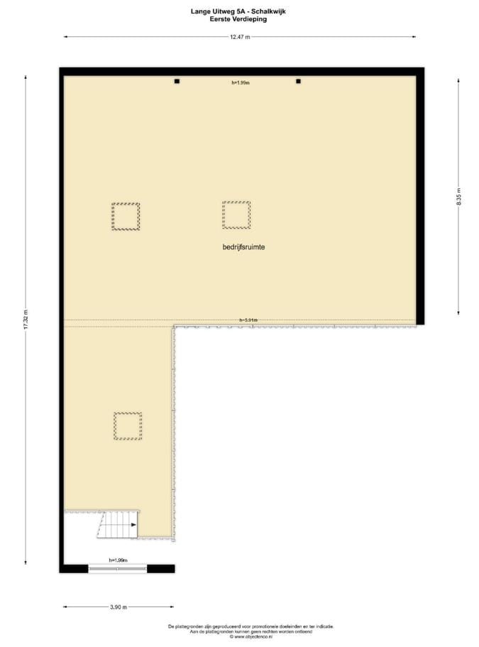 De bedrijfshal wordt zowel op de begane grond als de verdieping voorzien van vloerverwarming en van ledverlichting. De bedrijfshal wordt voorzien van een eigen elektra aansluiting en een elektrische overheaddeur. Op zowel de verdieping als de begane grond zijn diverse afvoerpunten aangebracht.