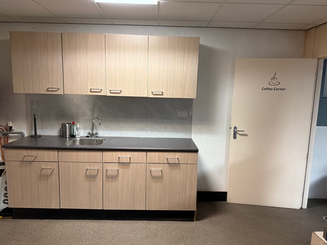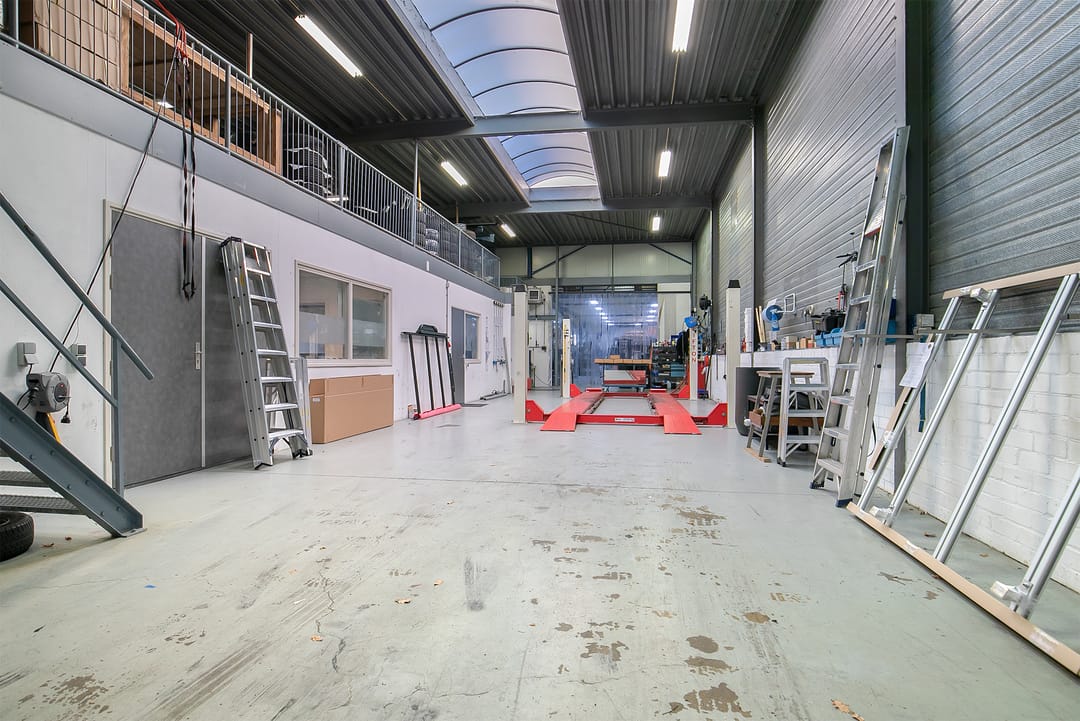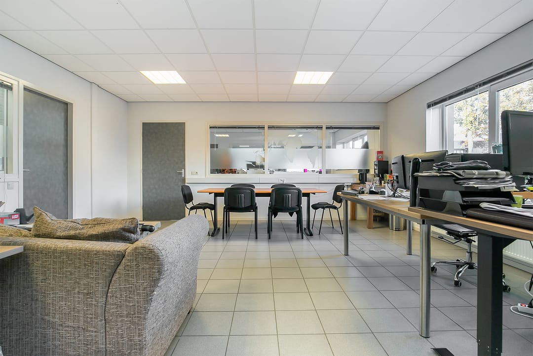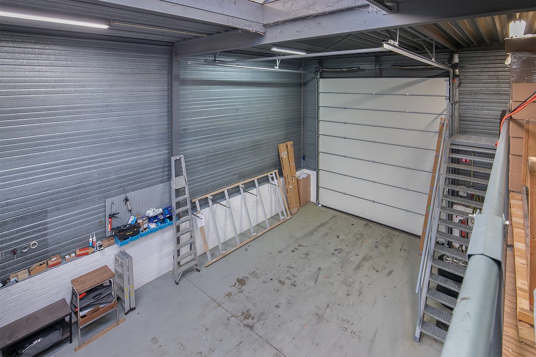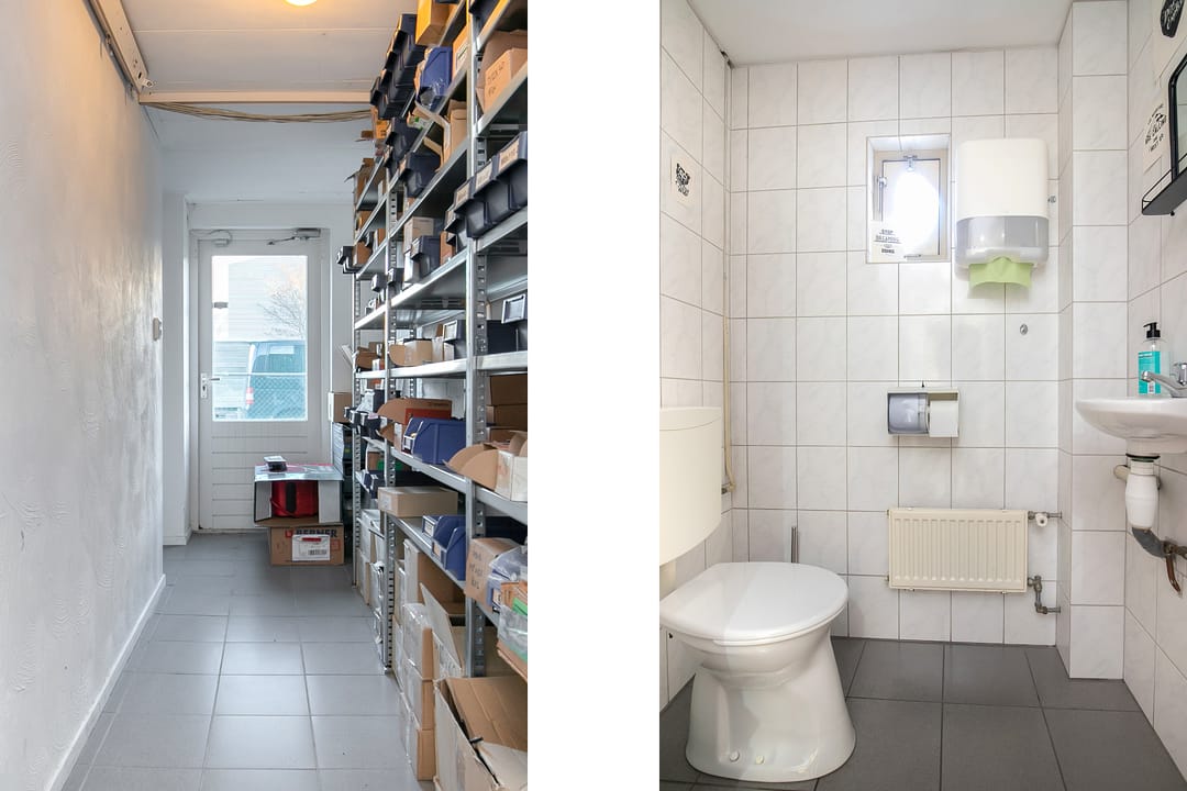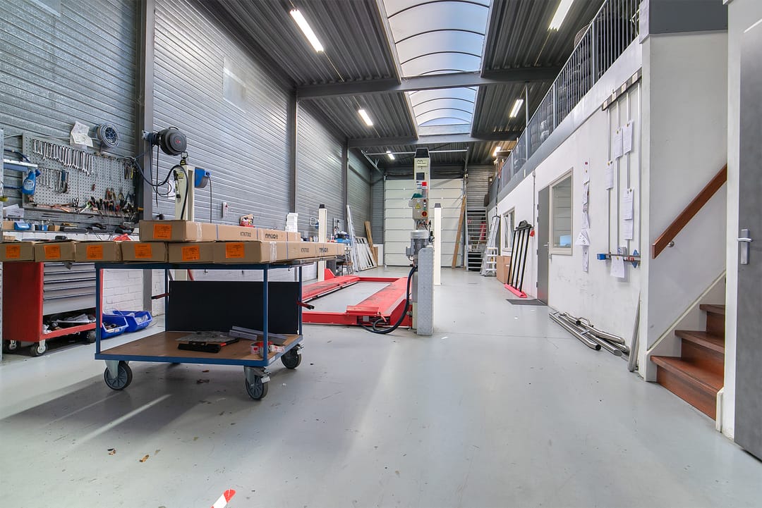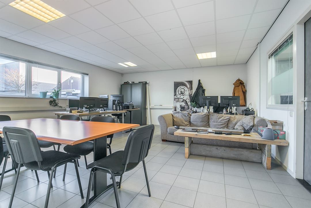 De eerste verdieping is ingericht als functionele ondersteunende laag en bestaat uit een kantine, overloop, opslagruimte en een werkplaats. De kantine is voorzien van een nieuw keukenblok. Deze ruimte is geschikt voor pauzes, overlegmomenten of informele werkbesprekingen. De opslagruimte biedt extra mogelijkheden voor goederen, archief of materialen, terwijl de werkplaats op deze verdieping extra flexibiliteit geeft voor uiteenlopende werkzaamheden. De verdieping wordt bereikt via twee vaste trappen vanuit de bedrijfsruimte en beschikt over een praktische indeling.