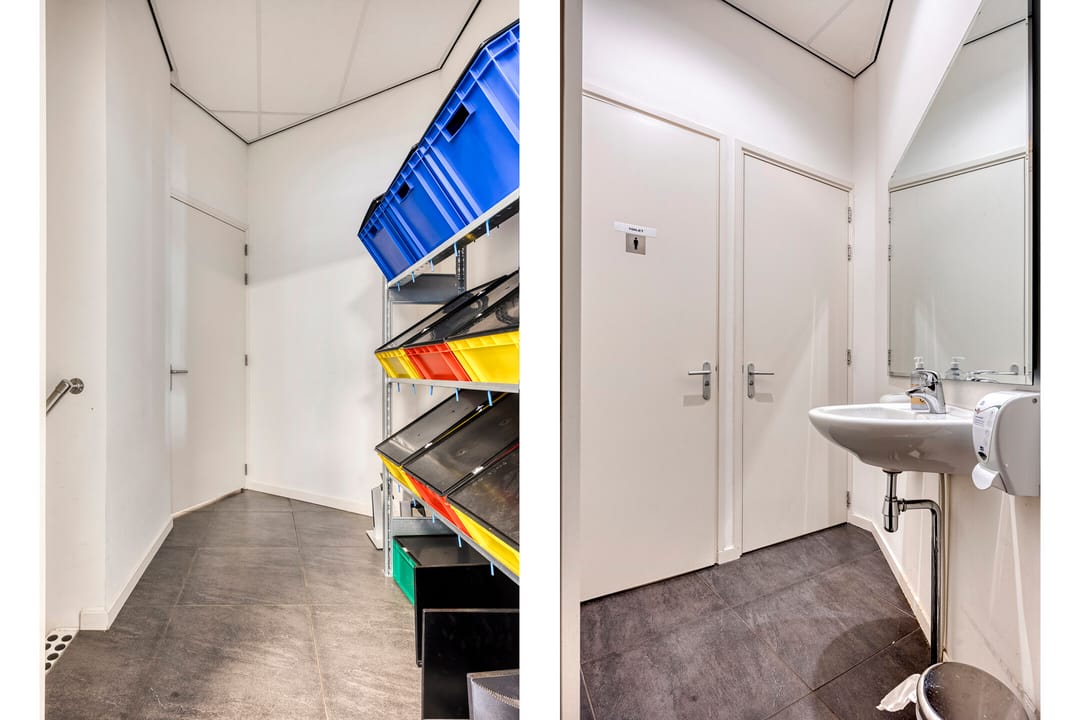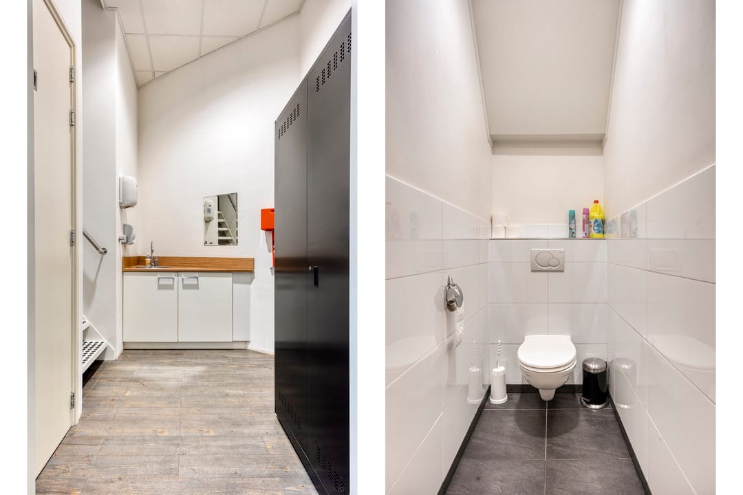 Op de eerste verdieping zijn 2 verschillende toiletruimten te vinden. De toiletruimte bij het grotere kantoor bestaat uit 3 toiletten. Ook beneden bij het magazijn is een toiletruimte. Daarnaast bevindt zich op de eerste verdieping een doucheruimte.