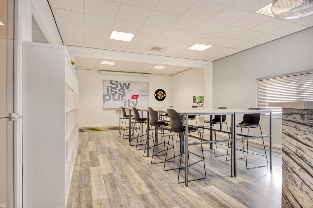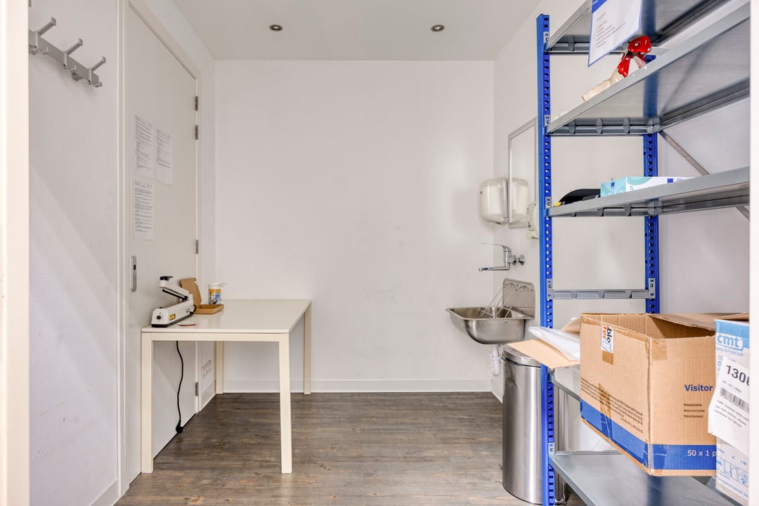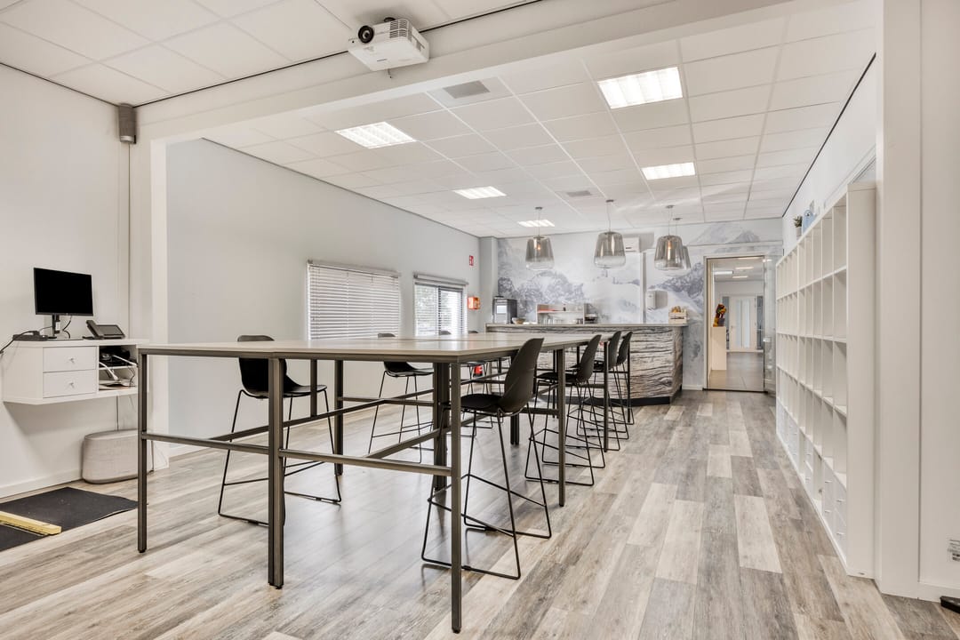 De ruime kantine op de eerste verdieping is uitgerust met een complete keuken waarin een vaatwasser, inductieplaat en oven aanwezig zijn. Vanuit de kantine loop je door richting de andere kant van het gebouw. Hier zijn nog eens twee kantoren gevestigd waarvan één grote waar ruimte is voor ongeveer 10 werkplekken.