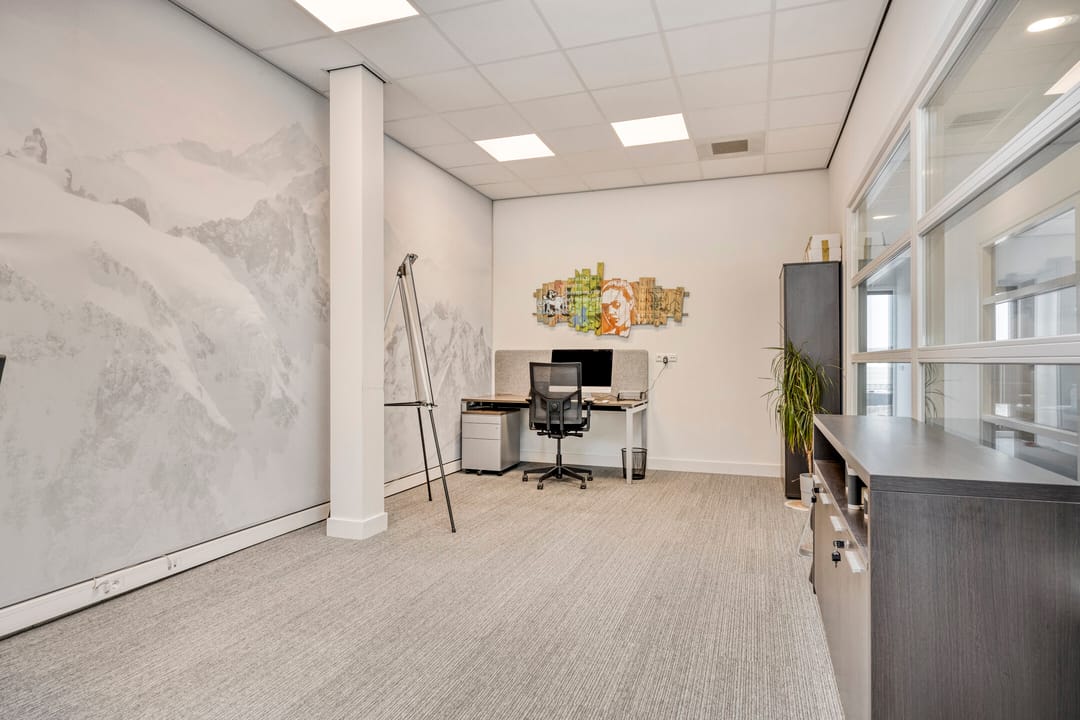 Boven aangekomen zijn er 2 kantoren aan je linkerhand. Deze hebben glazen wanden. Wanneer je doorloopt vind je rechts de grote vergaderruimte en nog 3 losse kantoren gelegen aan de gang. Hier bevindt zich ook de trap richting de tweede verdieping waar nog een kantoor- en vergaderruimte is.