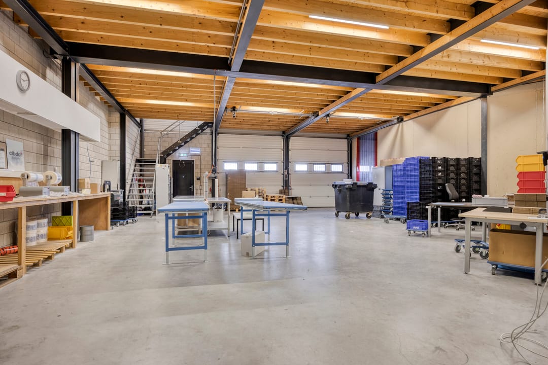 Wanneer je de bedrijfsruimte betreedt vanaf Kerkdijk-Zuid kom je binnen in de ruime ontvangsthal. Vanaf hier loop je rechts via een kantoor het magazijn in of met de trap naar boven richting de kantoren. Achter de trap bevindt zich nog een extra ruimte die voorheen als studio werd gebruikt.