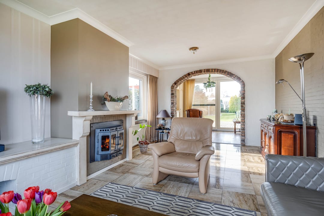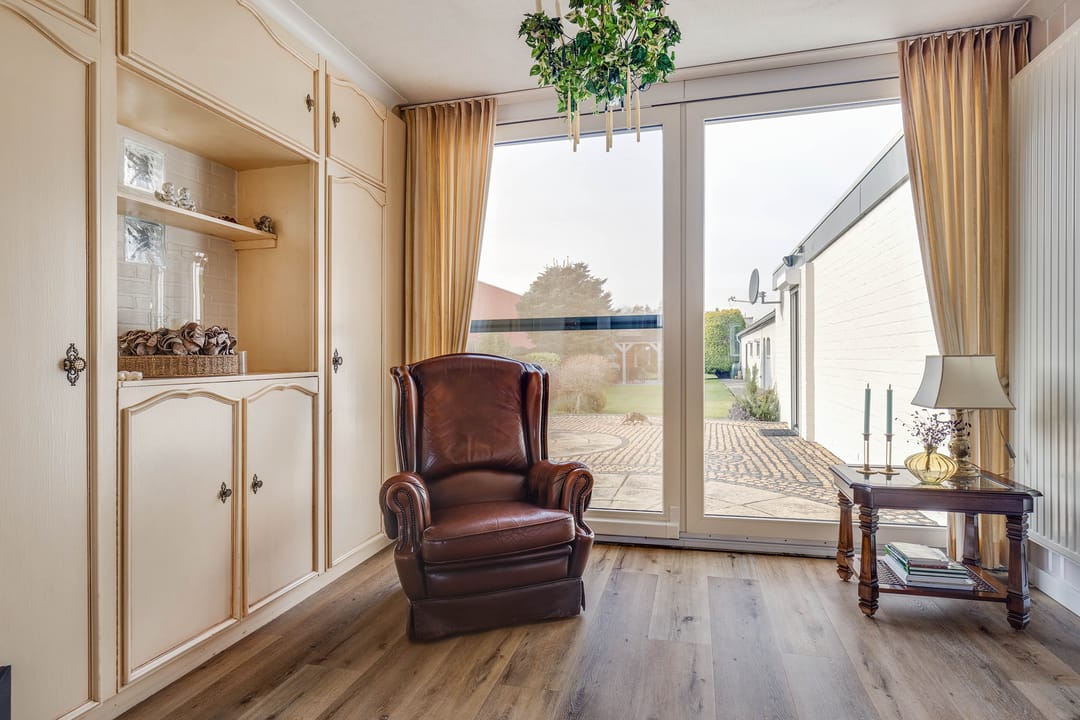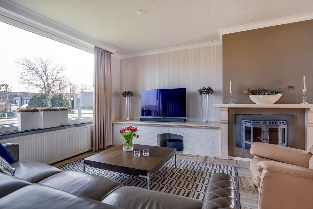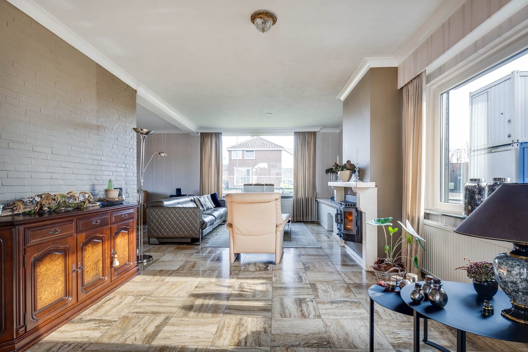 De L-vormige woonkamer is royaal van opzet. Dankzij de grote raampartijen aan zowel de voor-, zij- als achtergevel is er sprake van een aangename lichtinval. Aan de voorzijde biedt het brede raam zicht op de straat, terwijl aan de achterzijde via de schuifpui direct contact is met de tuin. De ruimte biedt voldoende plaats voor meerdere zitopstellingen en beschikt over een sfeervolle haard, wat zorgt voor extra warmte en karakter.