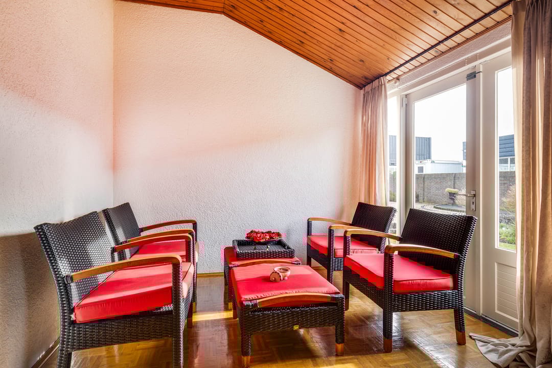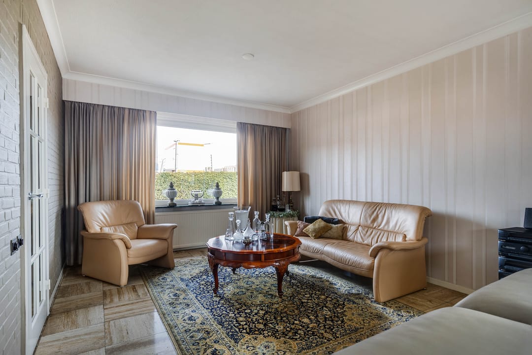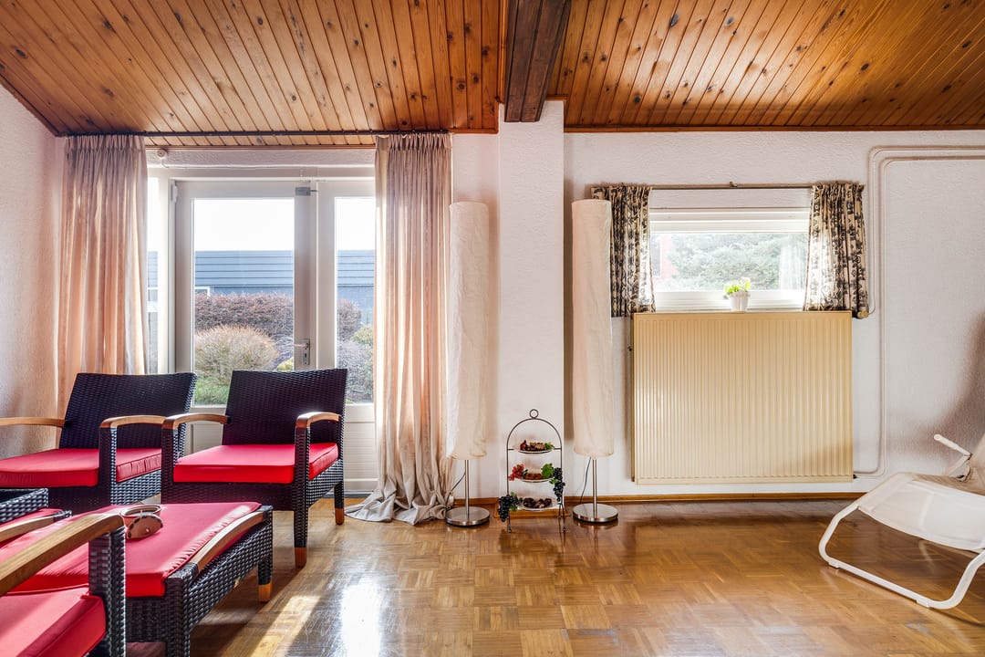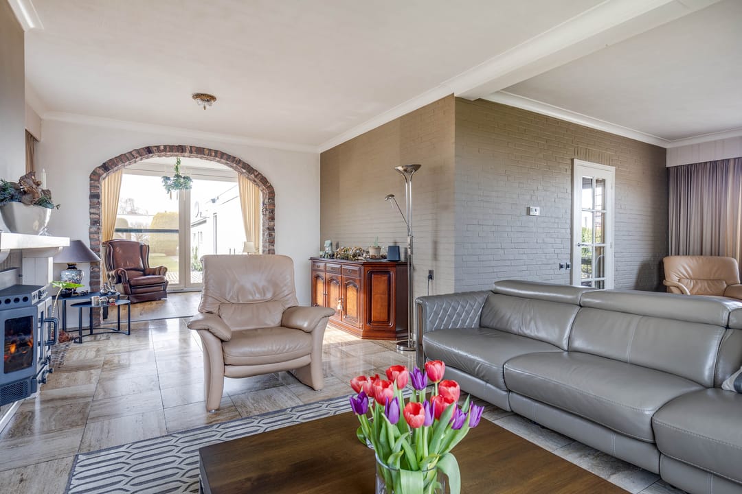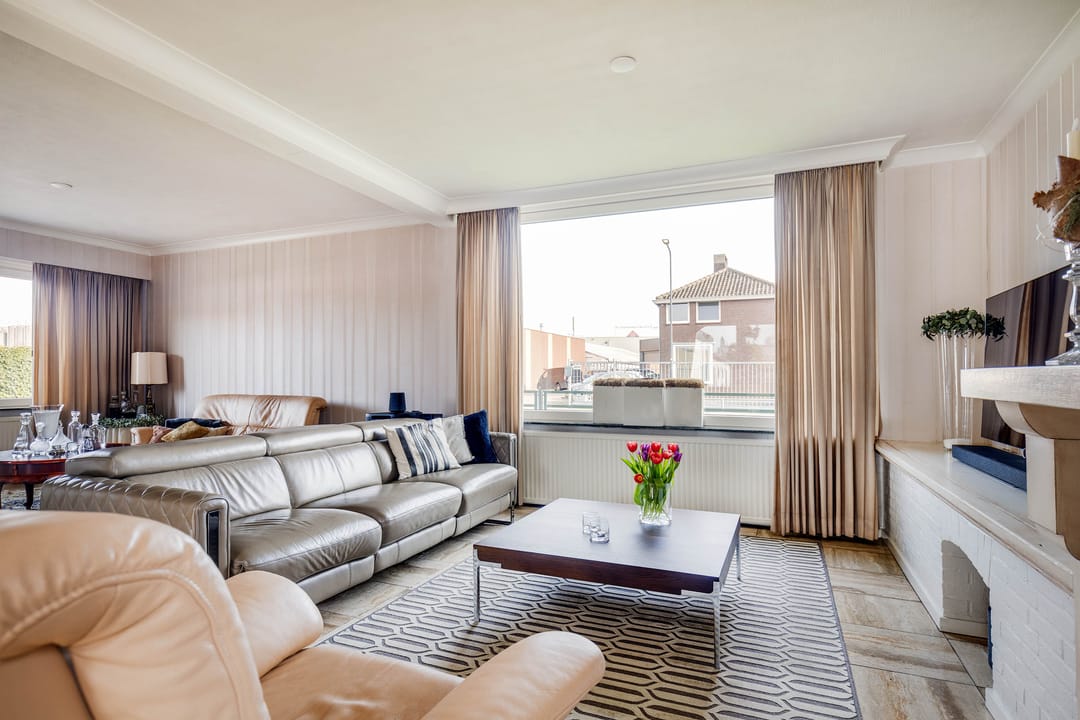 De L-vormige woonkamer is royaal van opzet. Dankzij de grote raampartijen aan zowel de voor-, zij- als achtergevel is er sprake van een aangename lichtinval. Aan de voorzijde biedt het brede raam zicht op de straat, terwijl aan de achterzijde via de schuifpui direct contact is met de tuin. De ruimte biedt voldoende plaats voor meerdere zitopstellingen en beschikt over een sfeervolle haard, wat zorgt voor extra warmte en karakter.