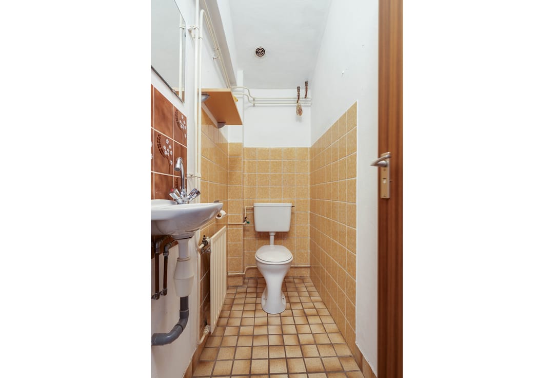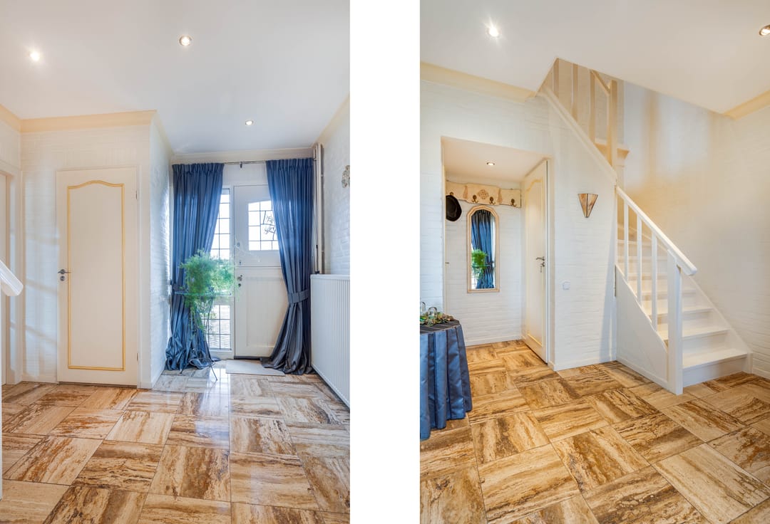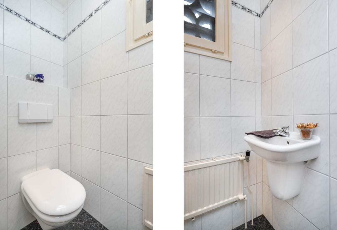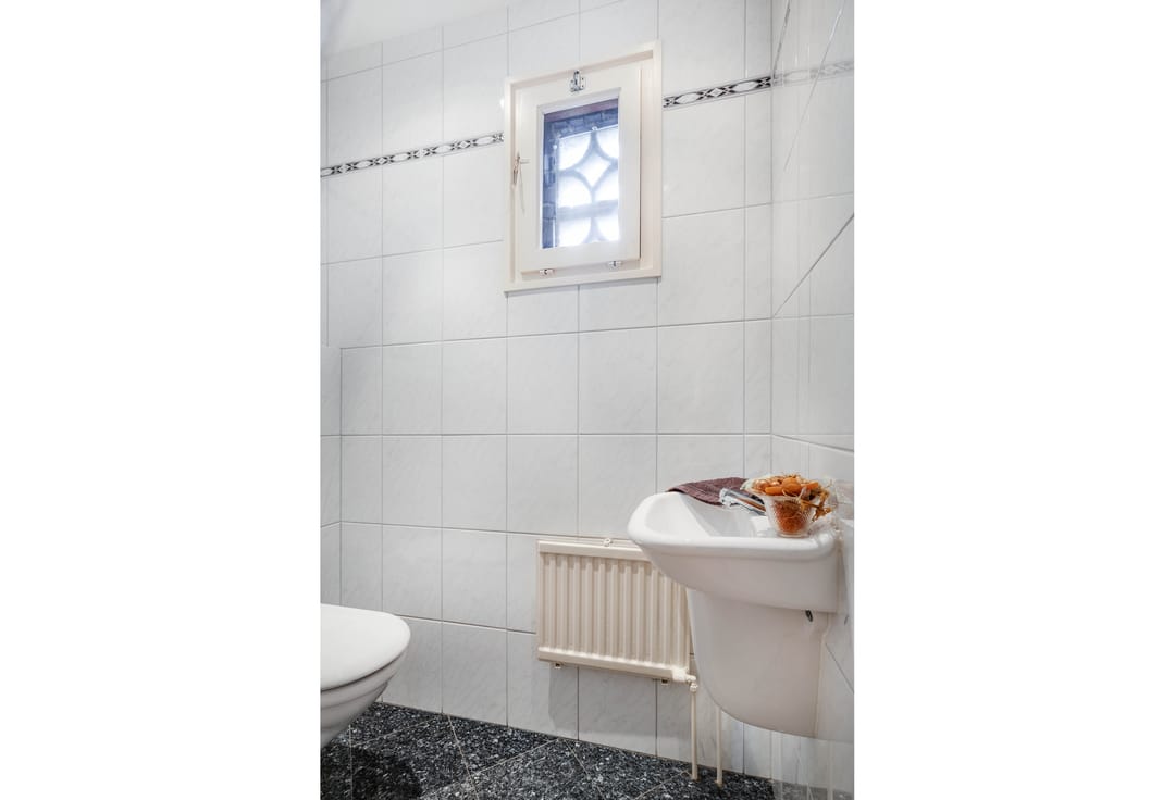 Via de entree aan de voorzijde wordt de woning betreden in een ruime betegelde hal. Hier bevinden zich de meterkast (volledig vernieuwd in 2023 en voorzien van krachtstroom), een betegelde toiletruimte met zwevend toilet en fonteintje en de trapopgang naar de verdieping. De hal is verzorgd afgewerkt en vormt een prettige binnenkomst met directe toegang tot de verschillende leefruimtes op de begane grond.