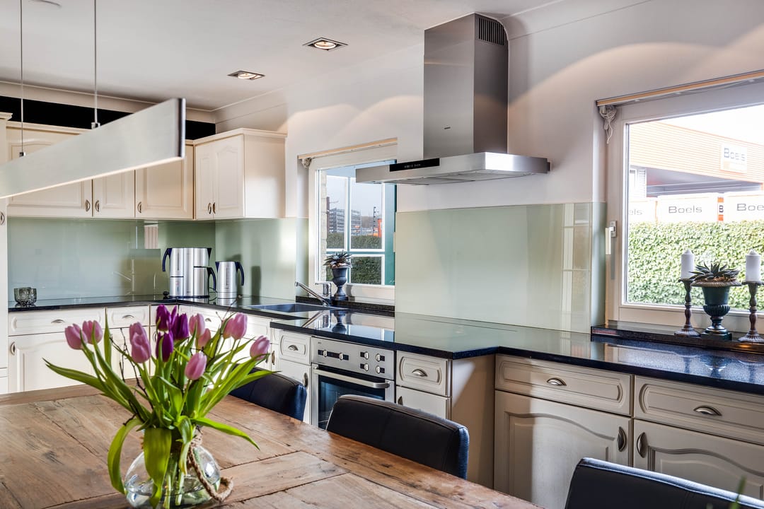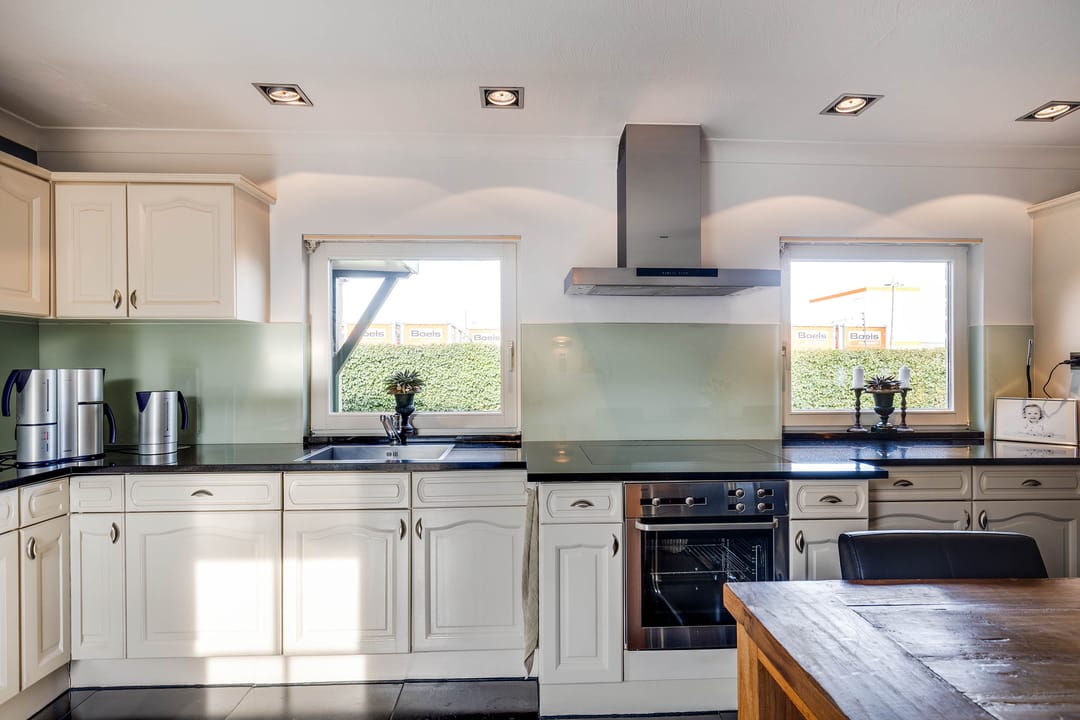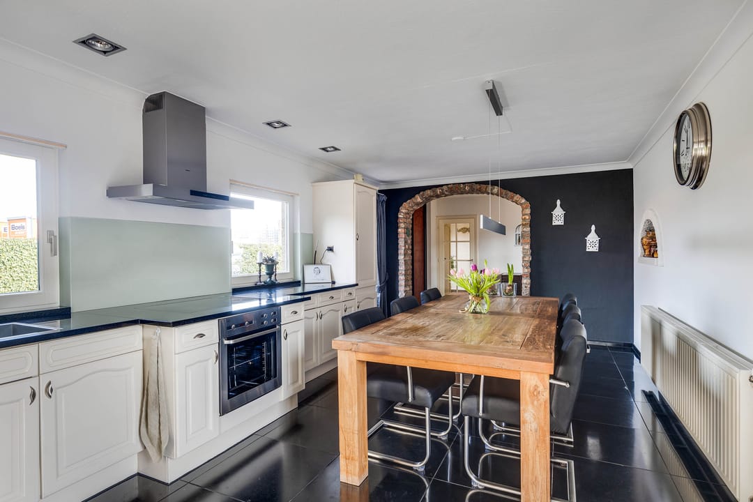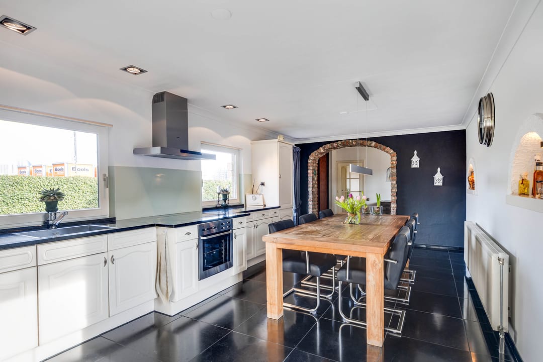 De leefkeuken bevindt zich in het verlengde van de woning en is uitgevoerd in een lichte opstelling met voldoende werk- en bergruimte. De keuken beschikt over diverse inbouwapparatuur en biedt ruimte voor een royale eettafel. De donkere tegelvloer in combinatie met de lichte keukenfronten en het uitzicht op de tuin geven de ruimte een eigentijdse uitstraling. Ook is de keuken voorzien van airco. Vanuit de keuken is eveneens directe toegang tot het terras en de tuin.