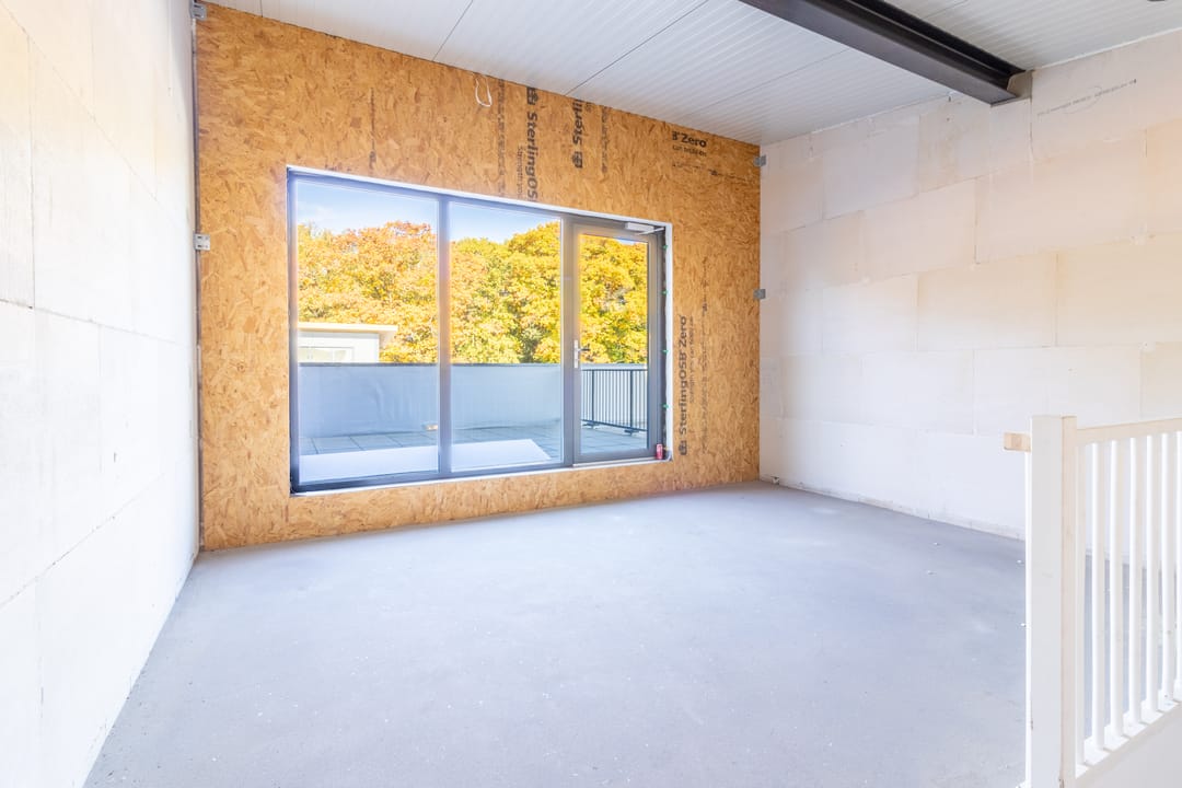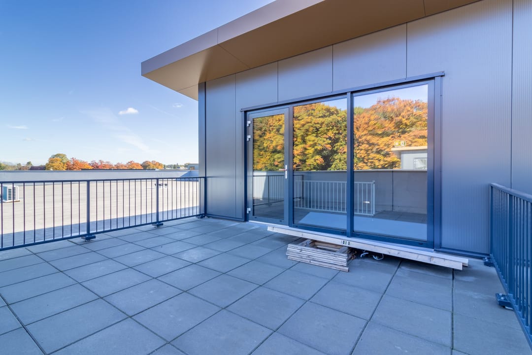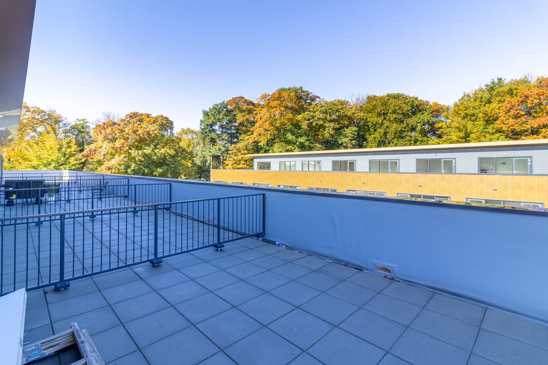 - dakterras op 1e verdieping voorzien van +/- 20m2 beton tegels;