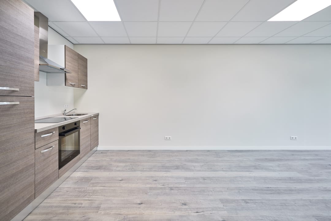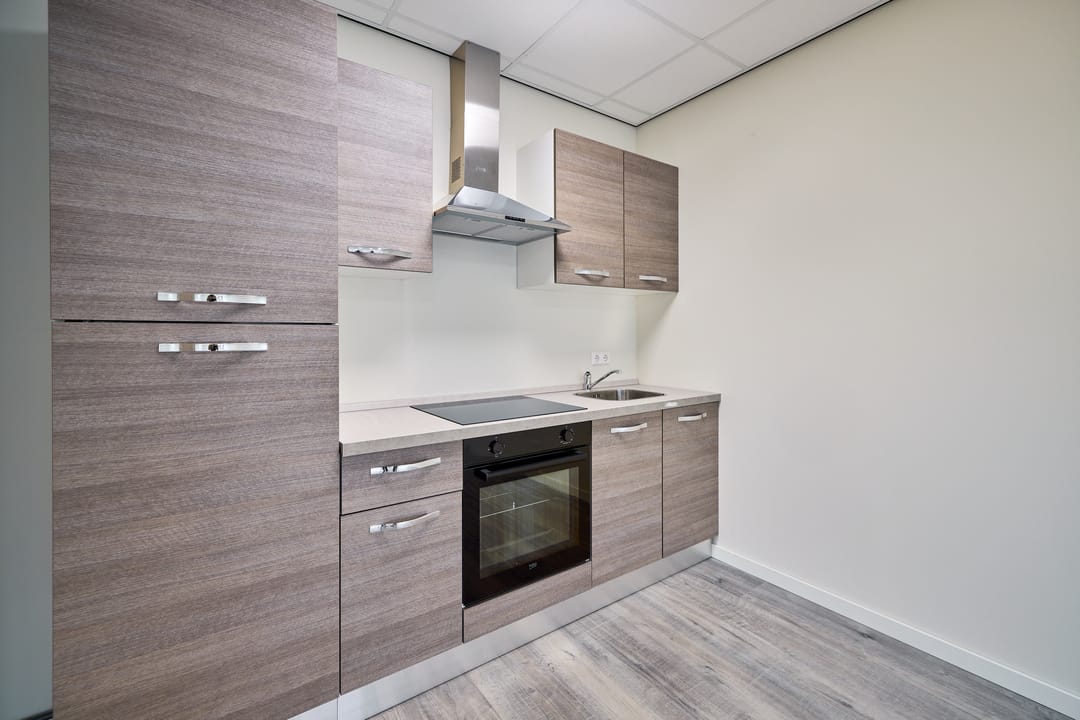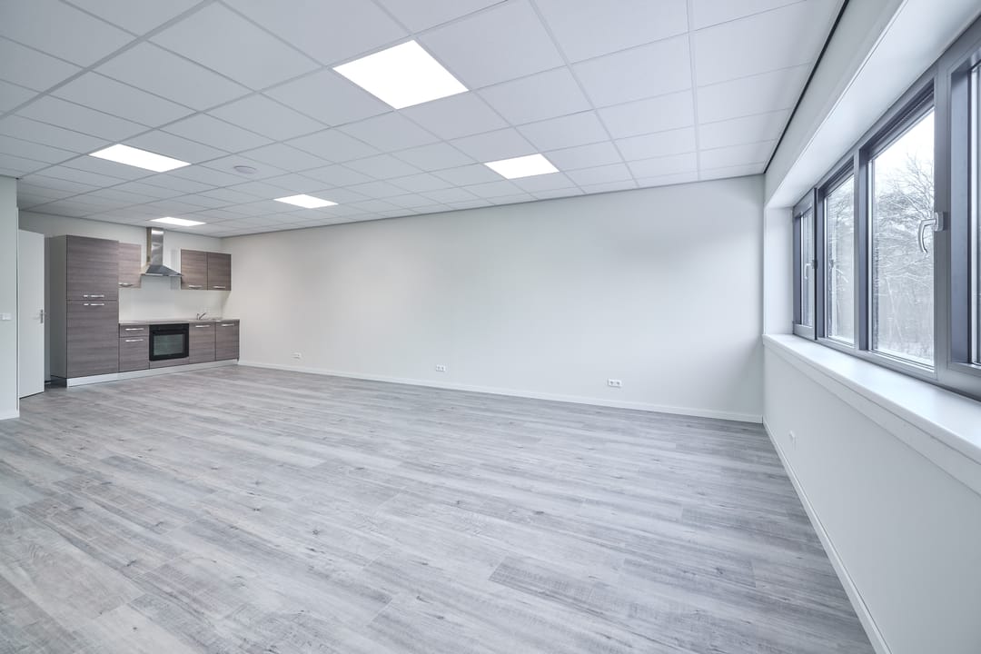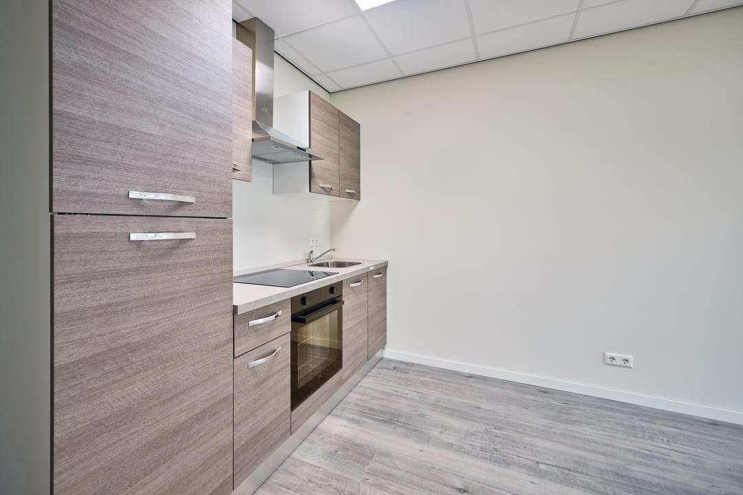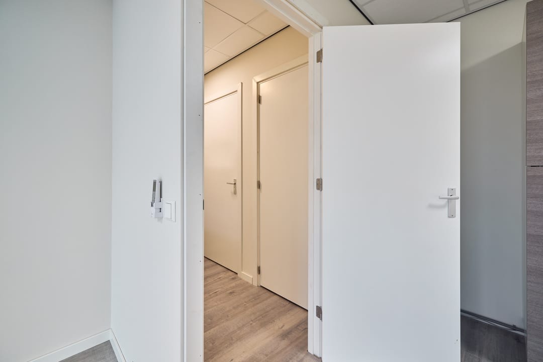 Overloop met toegang tot het kantoor, de keuken en de badkamer. Het kantoor is voorzien van een systeemplafond met ledverlichting en een moderne laminaatvloer. In de keuken vind je onder andere een inductiekookplaat, oven, afzuigkap, koelkast, vriezer en spoelbak. Warm water wordt geleverd via een elektrische boiler van 100 liter. De badkamer beschikt over een tweede toilet, een wastafel en een douche.