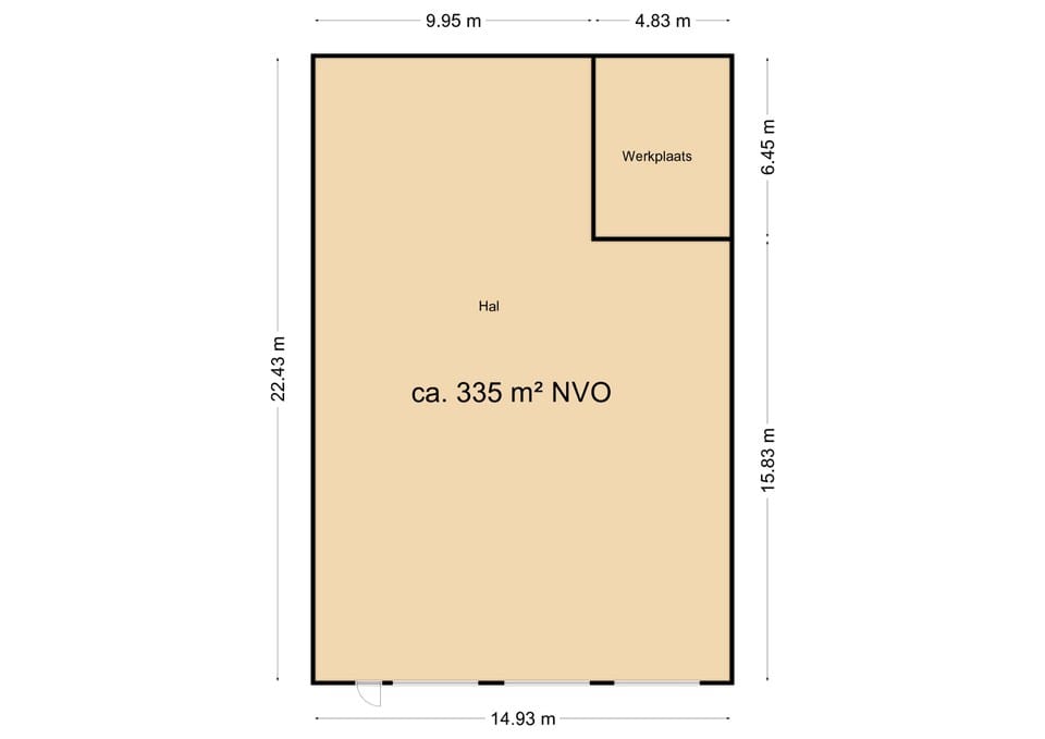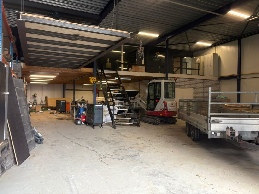 Via 3 elektrische sectional deuren of via de aparte loopdeur aan de voorzijde toegang tot de bedrijfshal. De hal is ca. 15m breed en 22m diep en afgewerkt met een gevlinderde betonvloer en metselwerkwanden. Aparte werkplaats in de achterzijde van de hal. Entresol vloer met onder andere een kantoorruimte op de 1e verdieping. Er is een toiletruimte aanwezig in de bedrijfshal. De entresol kan in overleg worden aangepast.