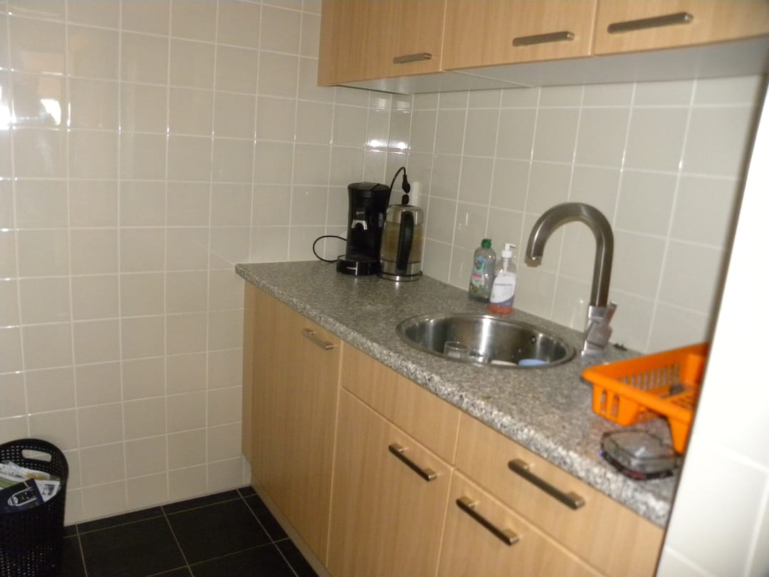 Modern keukenblok met koelkast en dubbele toilet groep; spreek cq. Vergaderruimte, 2e kantoorruimte aan de voorzijde met kabelgoten, airco unit en vaste kast.