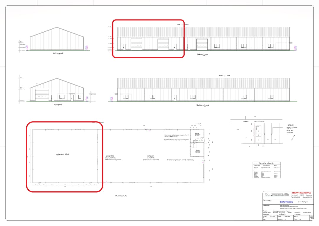 De bedrijfshal is ca. 24 breed en 20 meter diep en beschikt over 2 elektrisch bedienbare overheaddeuren (ca. 400 cm breed en 410 cm breed) en een toiletruimte.