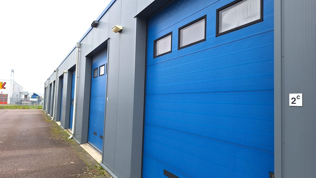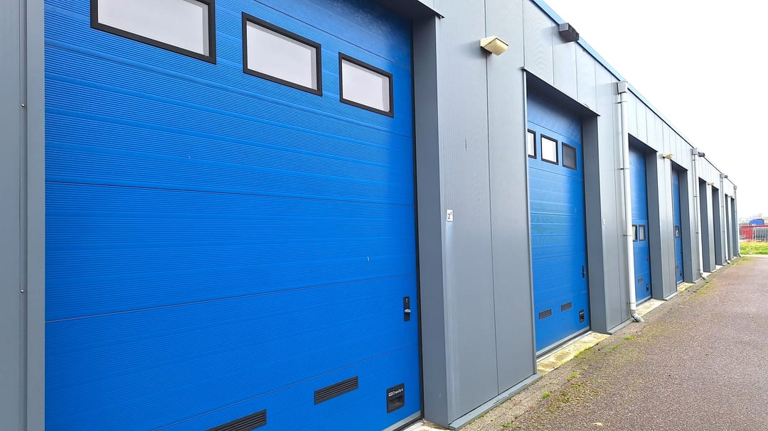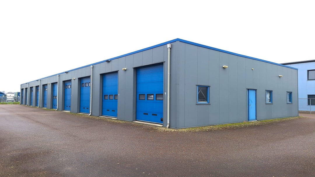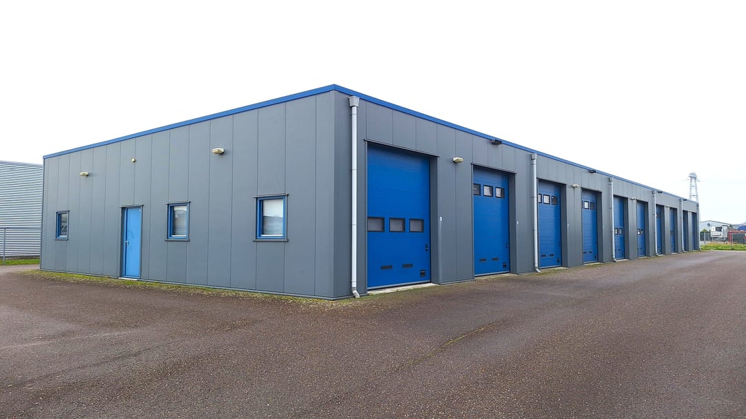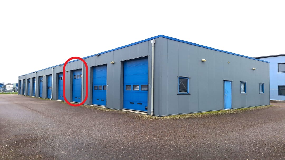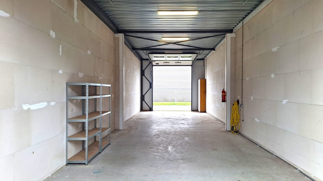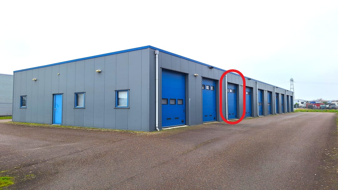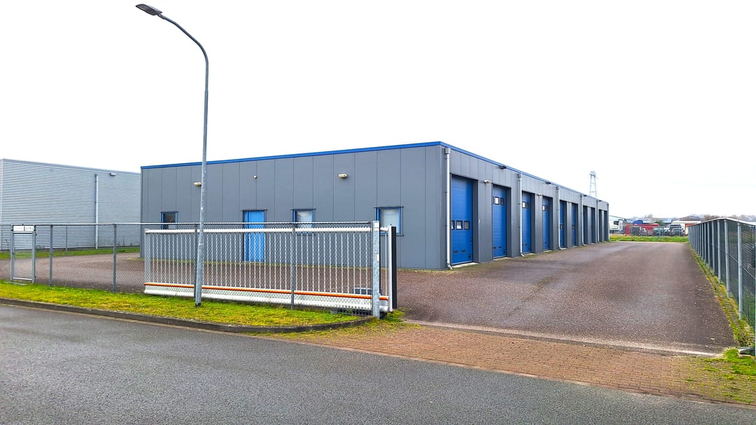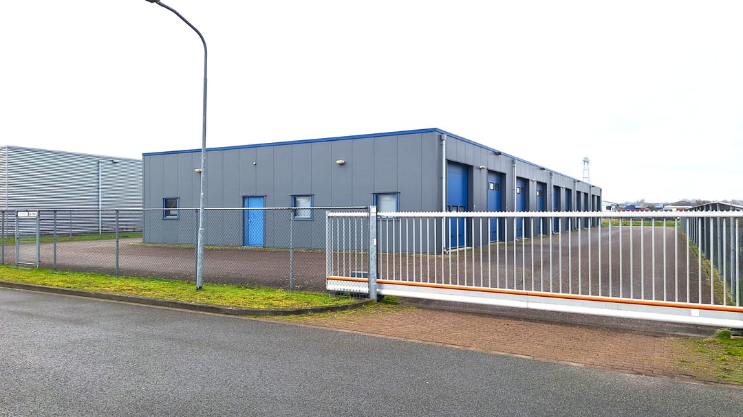 Royale bedrijfsunit van ca. 80 m² met 2 overheaddeuren in de voor- en achtergevel en gelegen in een bedrijfsverzamelgebouw op een volledig afgesloten terrein met elektrisch bedienbare schuifpoort.