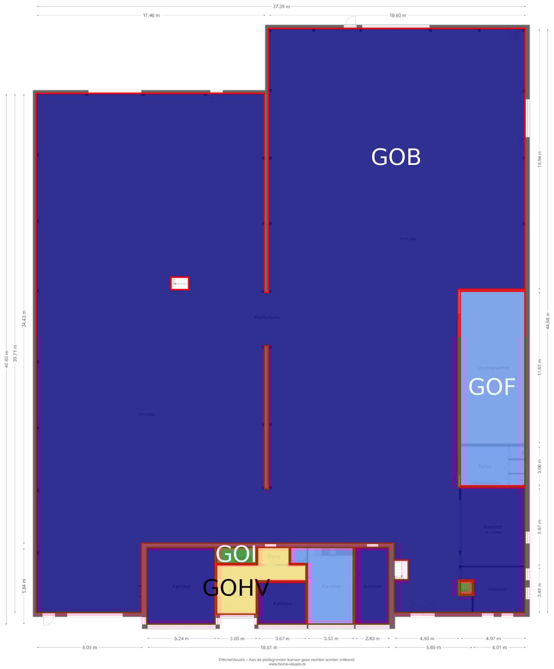 Het geheel beschikt over een totale gebruiksoppervlakte van circa 1.700 m² bedrijfsruimte, waarvan circa 983 m² bestaat uit bedrijfshal en circa 170 m² is ingericht als kantoorruimte met kantine en sanitaire voorzieningen. De aanwezigheid van een verdieping zorgt voor extra functionele ruimte, geschikt voor opslag of aanvullende werkplekken.