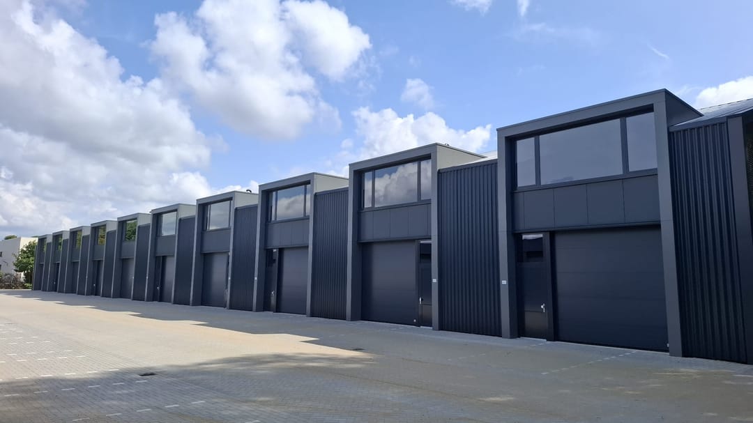De gevels zijn voorzien van geïsoleerde sandwichpanelen met een moderne industriële uitstraling. De aluminium gevelelementen zijn standaard uitgevoerd met HR++ beglazing en zijn gemonteerd in wit gegronde houten stelkozijnen. Elke unit beschikt over een handbediende overheaddeur met geïntegreerde loopdeur.
