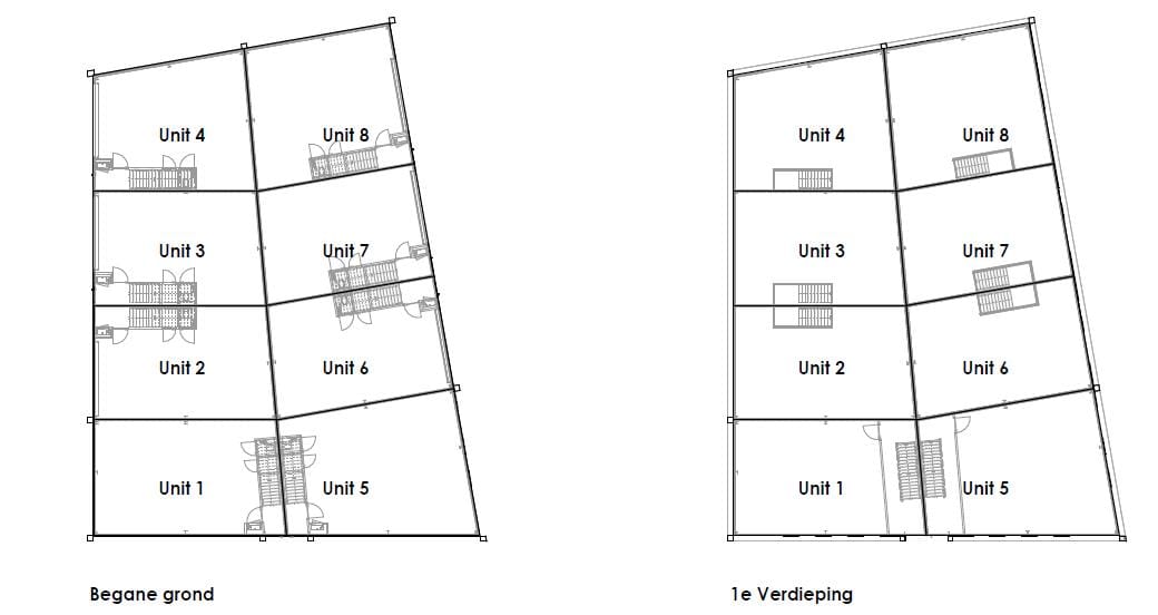 Hoekunit (unit 4): 79 m² op de begane grond en 79 m² op de verdieping.