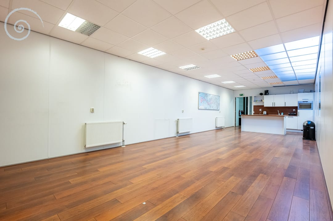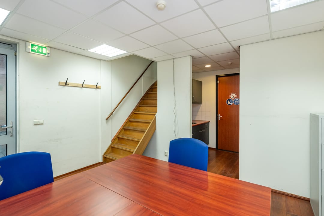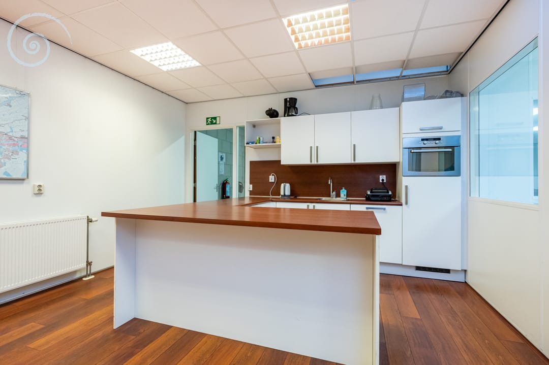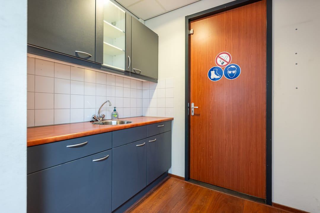 De verdieping van circa 90 m2 beschikt over een kantoorruimtes en kantine/vergaderkamer en keukenopstelling.