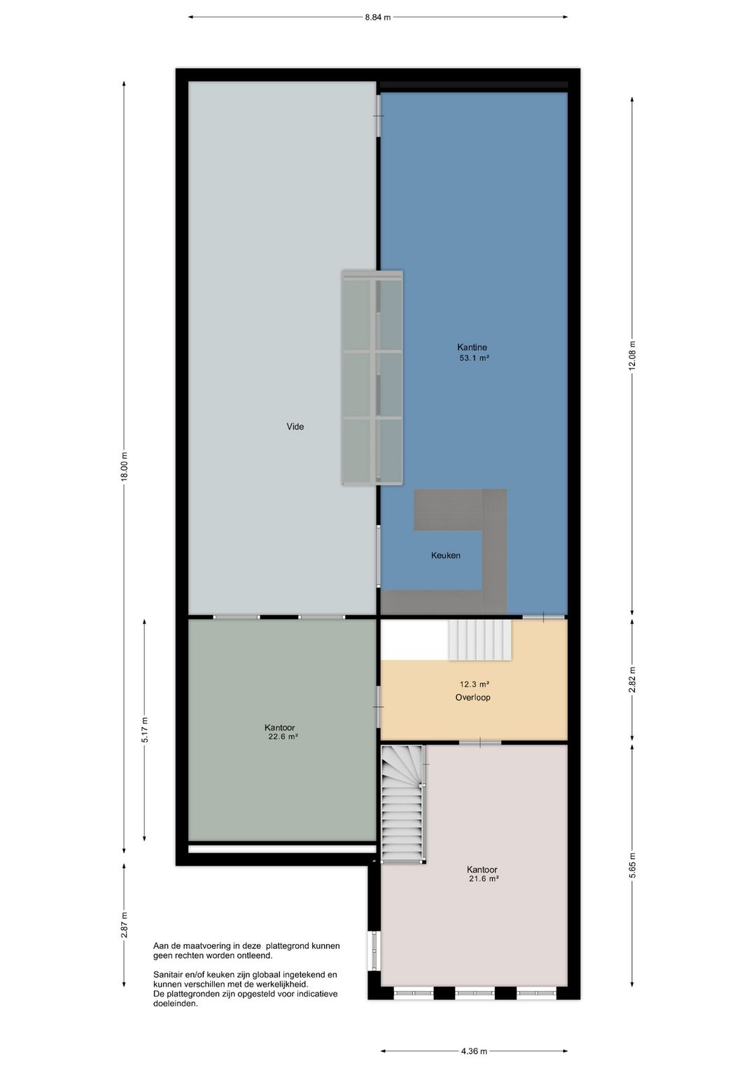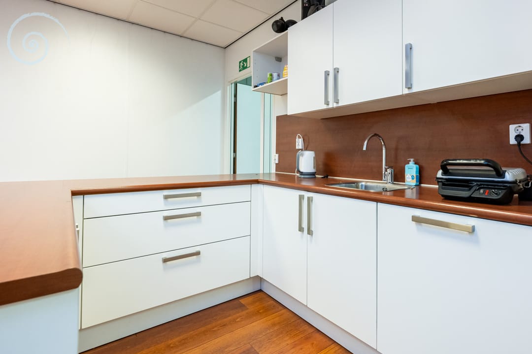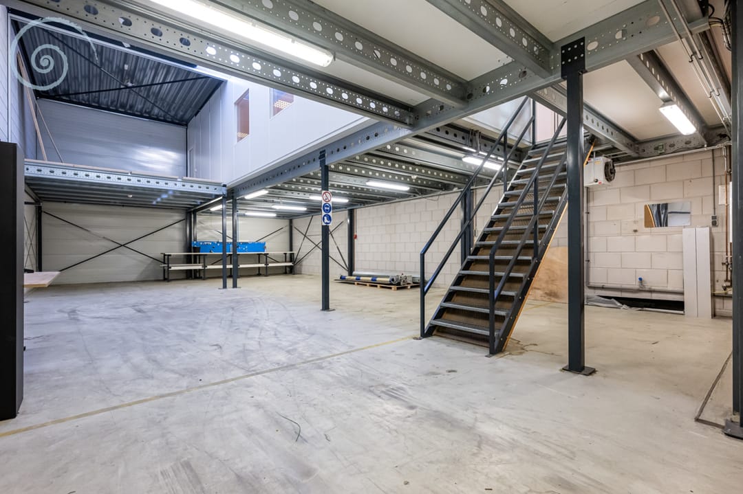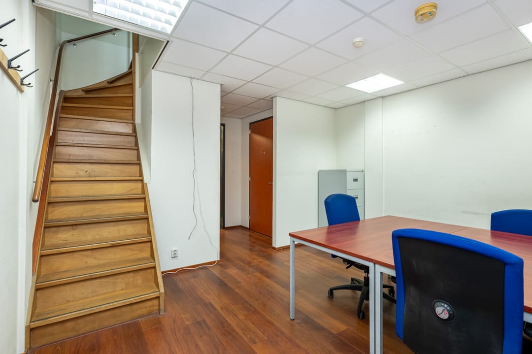 De verdieping van circa 90 m2 beschikt over een kantoorruimtes en kantine/vergaderkamer en keukenopstelling.