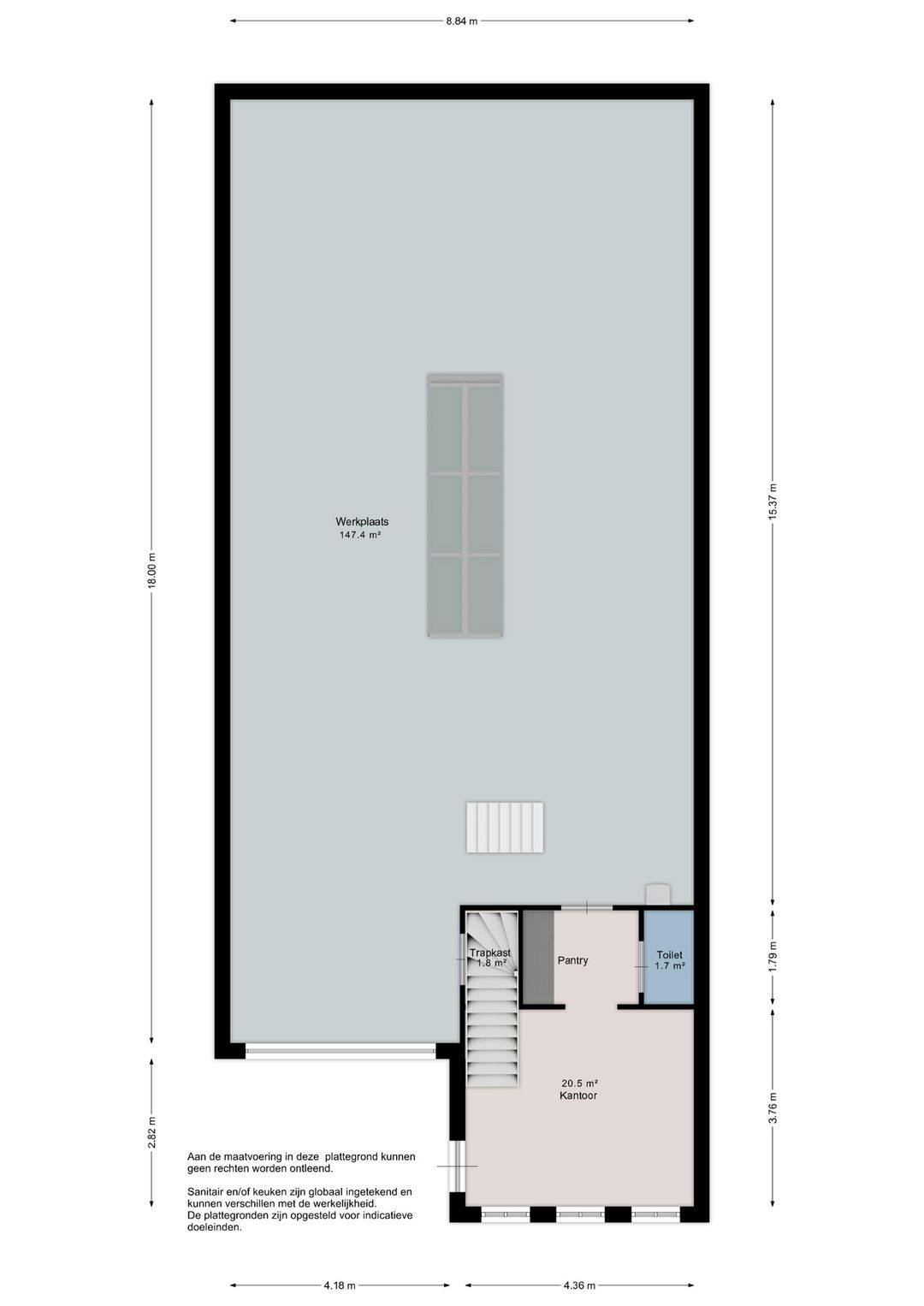 De begane grond is voorzien van circa 25 m2 kantoorruimte met pantry en toilet en circa 147 m2 bedrijfsruimte met overheaddeur, heater en meterkast met krachtstroom.
