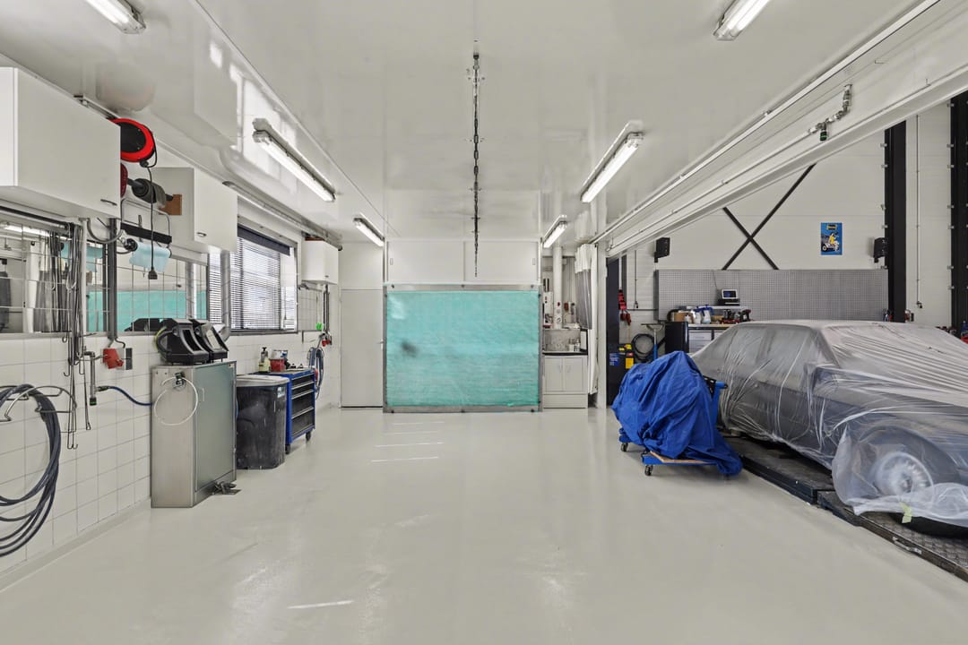 Daarnaast zijn aanwezig: een compressor met droger, een spuitwand, een werkbank met afzuiging in de spuiterij en een voorbereiding voor een lichtstraat. Op de bovenverdieping bevinden zich een keuken-/kantine-/kantoorruimte, extra magazijnruimte en een aansluiting voor lucht en 1x 380 volt.