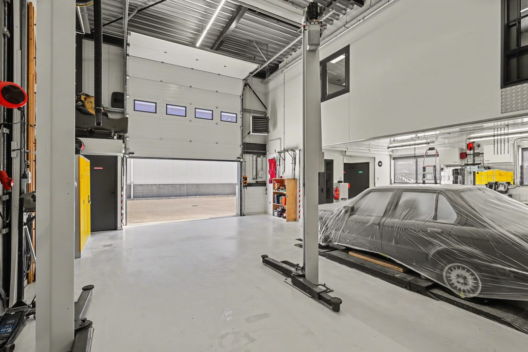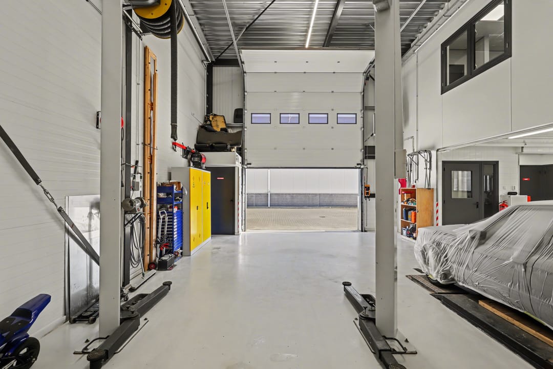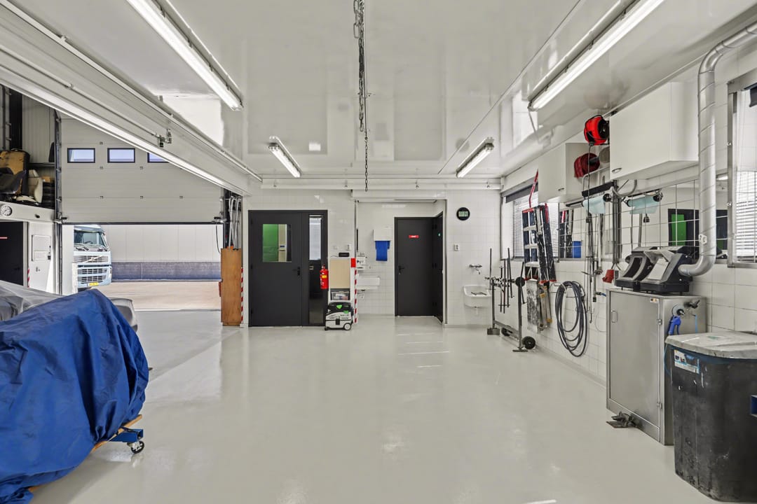 De bedrijfsruimte is ingericht voor doelmatig gebruik en onder meer voorzien van een overheaddeur met afstandsbediening en sensor, een olie- en waterafscheider inclusief afvoerput in de werkplaats, CV en heteluchtverwarming, LED-verlichting, 10 stuks 380V-aansluitingen in de werkplaats, luchtaansluitingen en een plafondventilator die de warme lucht via een thermostaat terug de ruimte in blaast.