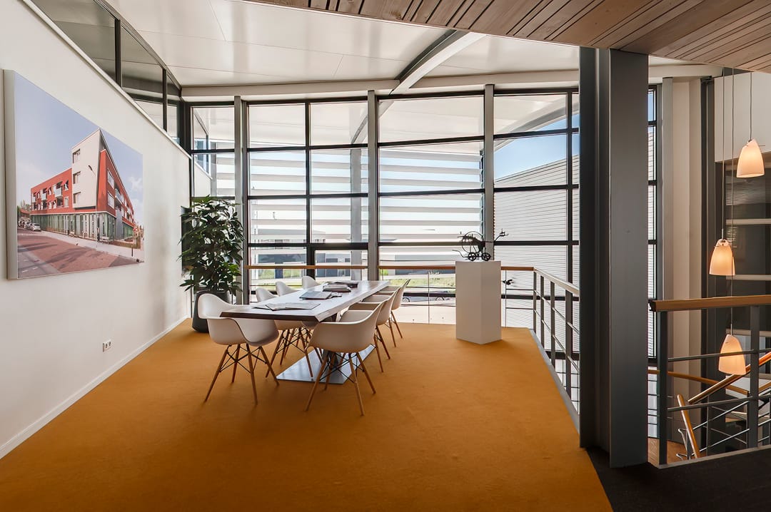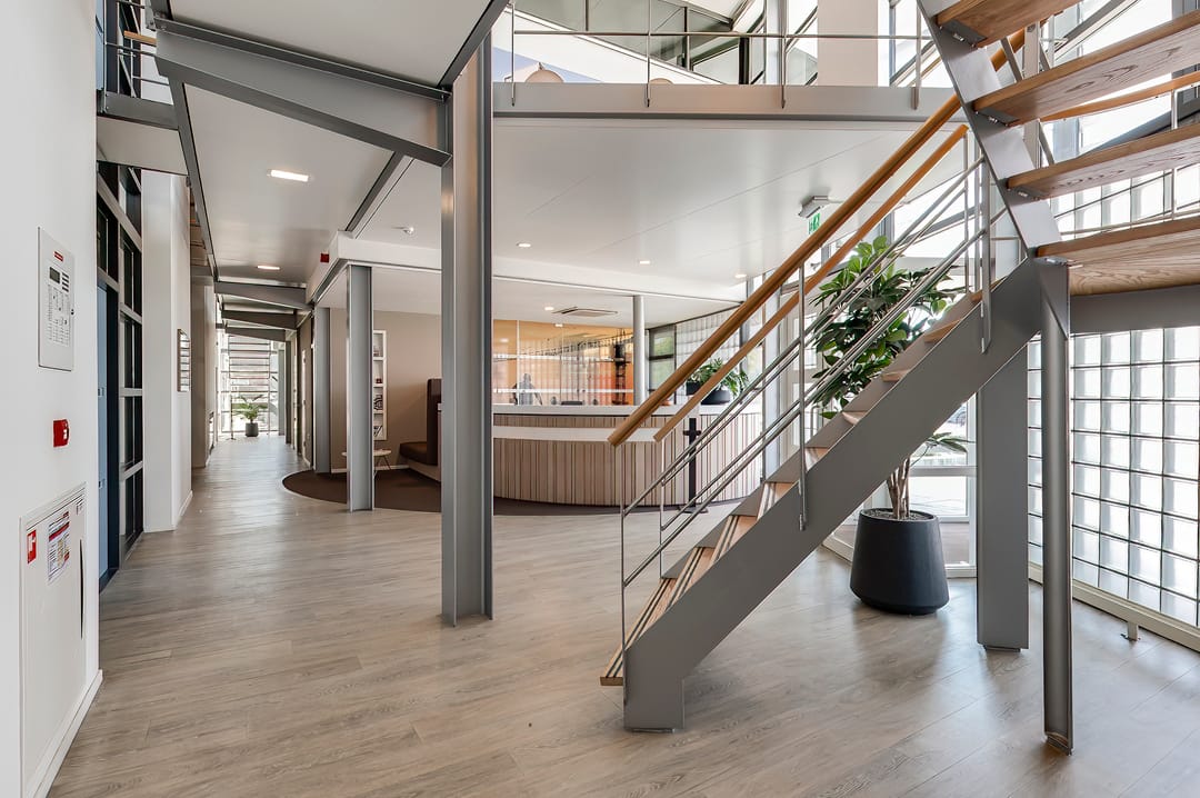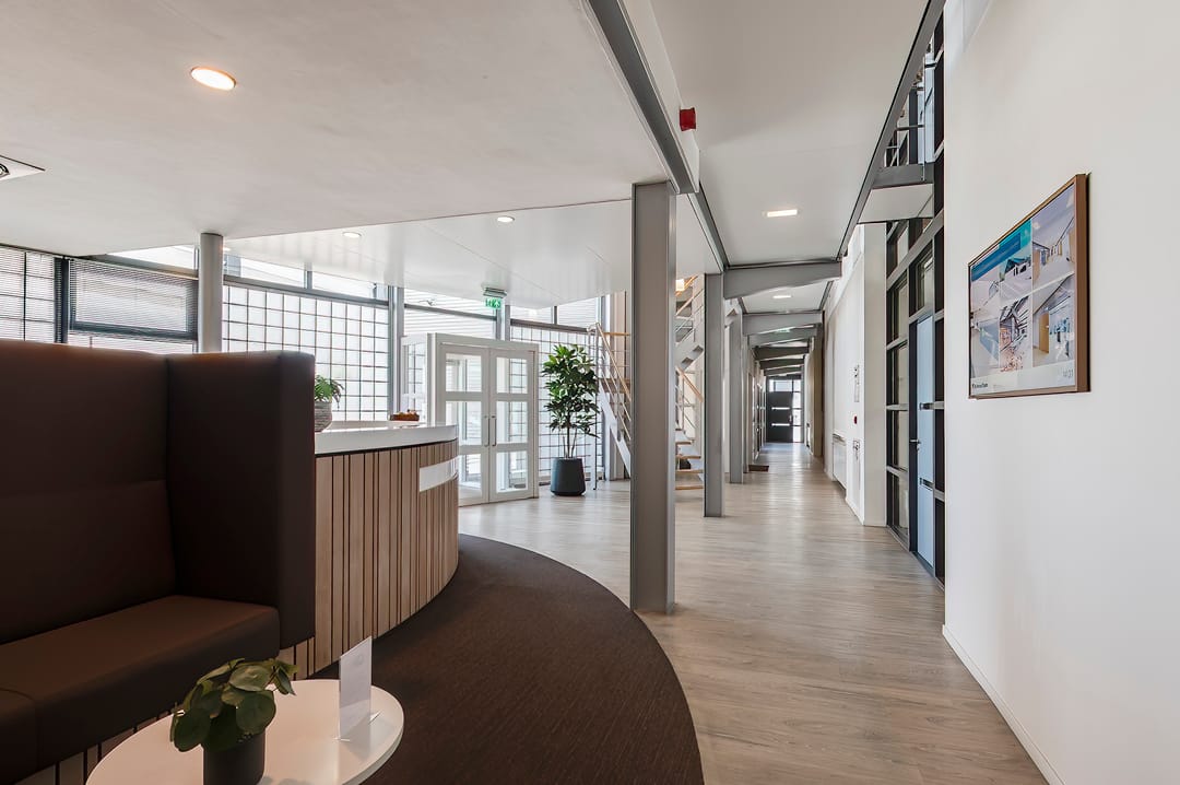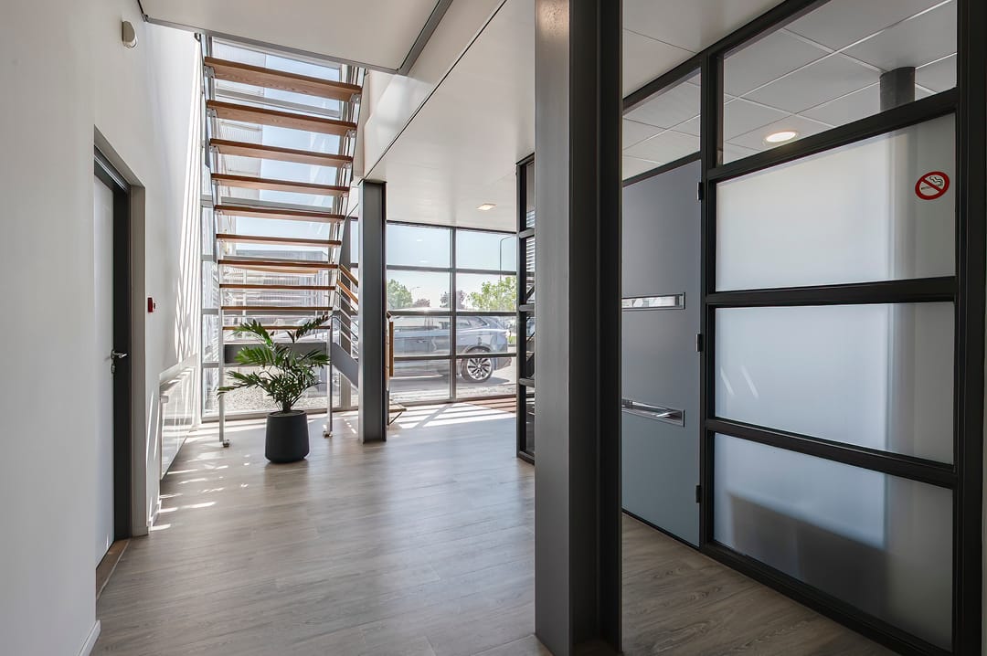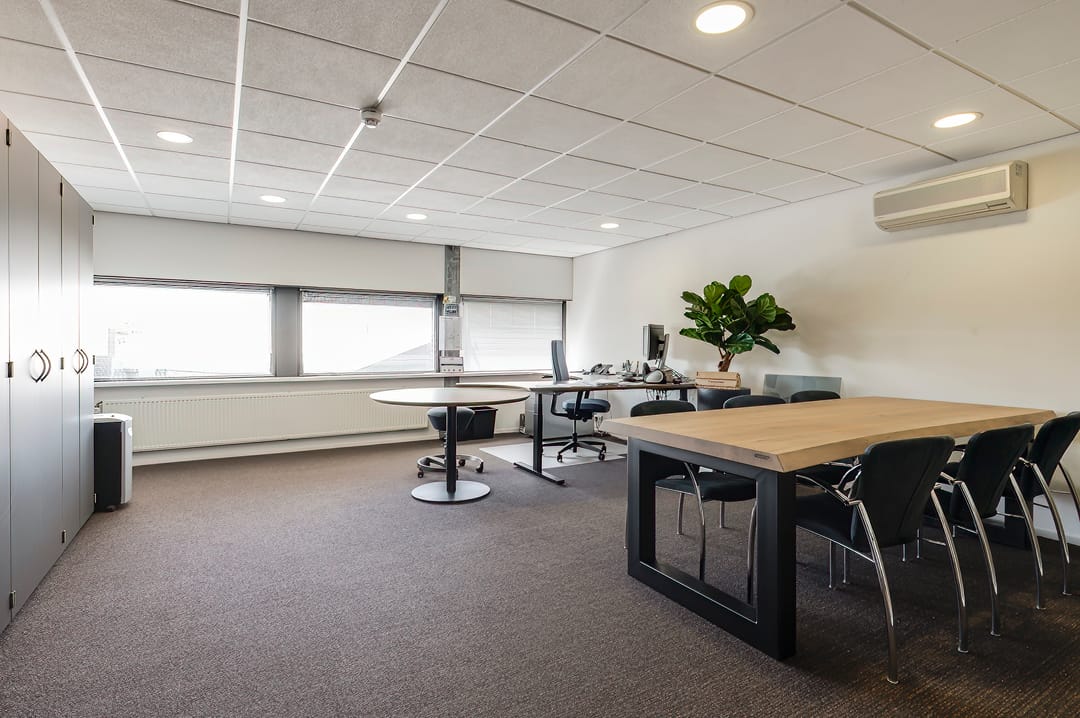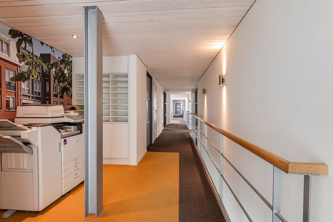 Indeling tot de kantoorruimte via twee entrees, beide aan de voorzijde van het gebouw. Via deze entrees is een centrale gang bereikbaar, bij de hoofdentree bevindt zich een verbreding met wachtruimte en balie. Langs de gang bevinden zich langs de buitengevel van het gebouw op de begane grond vijf kantoorkamers, langs de binnen gevel van het gebouw bevinden zich op de begane grond een kantoorkamer, een vergaderzaal en een archiefruimte. Via de centrale gang zijn voorts drie toiletten en een schoonmaakruimte bereikbaar. De achtergelegen bedrijfsruimten zijn via directe en indirecte toegangen vanuit de centrale gang bereikbaar.