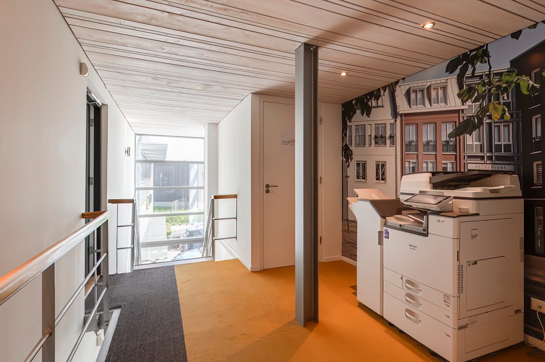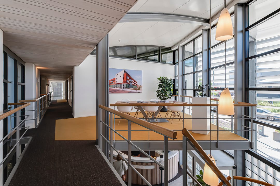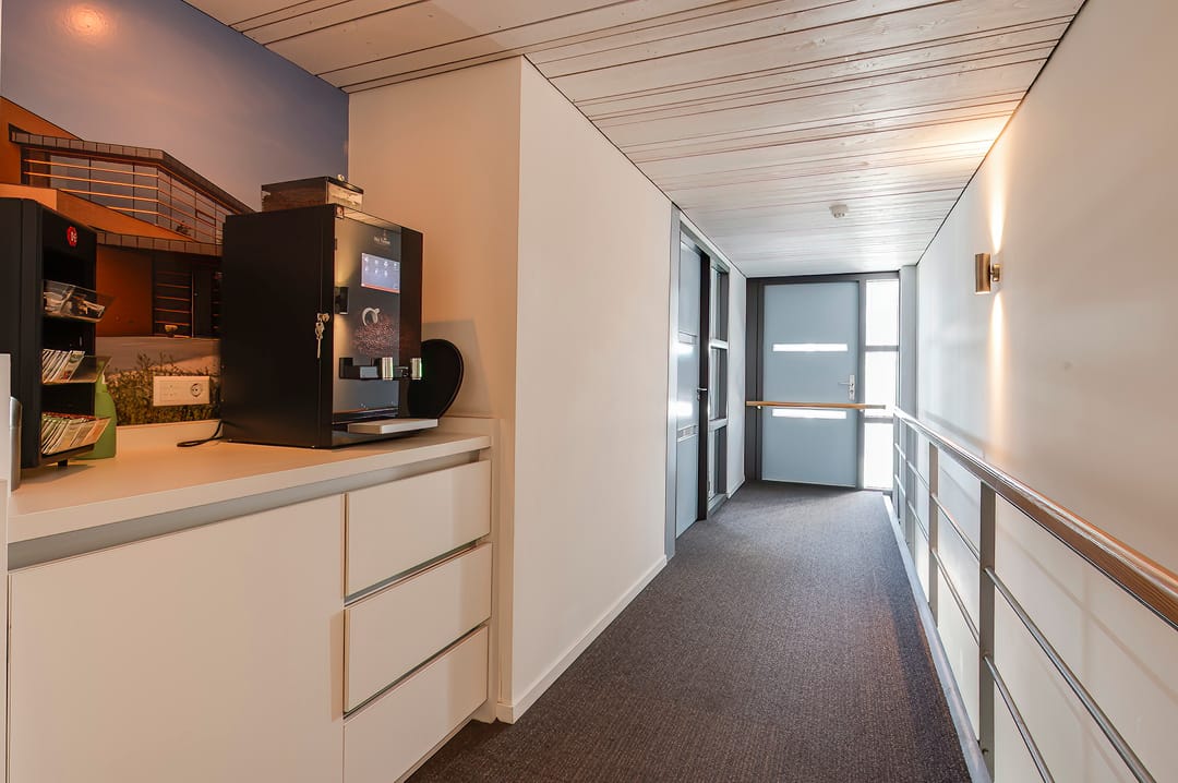 Op de eerste etage bevindt zich eveneens een centrale gang met vijf kantoorkamers en een koffieruimte langs de voorgevel. Twee kantoorkamers bevinden zich langs de binnen gevel, evenals een reproruimte en de cv-ruimte. Aan de zuidwestzijde van het gebouw bevindt zich de kantine met pantry en uitgebreide sanitaire voorzieningen. Voorts zijn op de etage twee toiletten en een pantry ten behoeve van de kantoorgebruikers aanwezig.